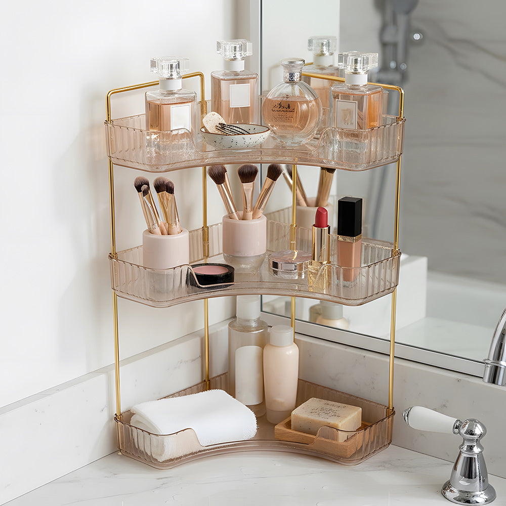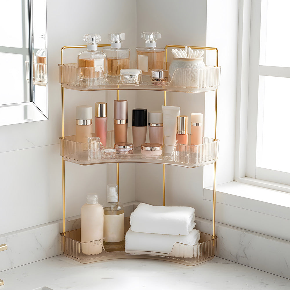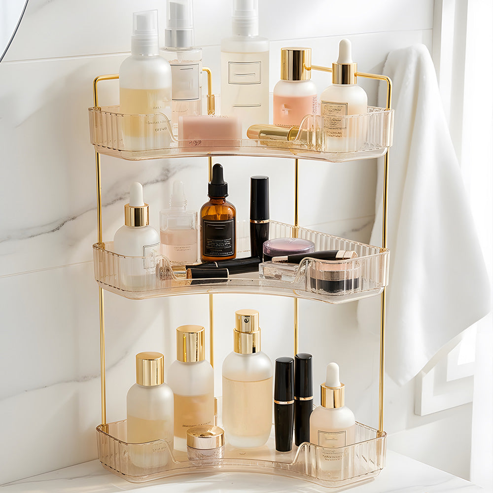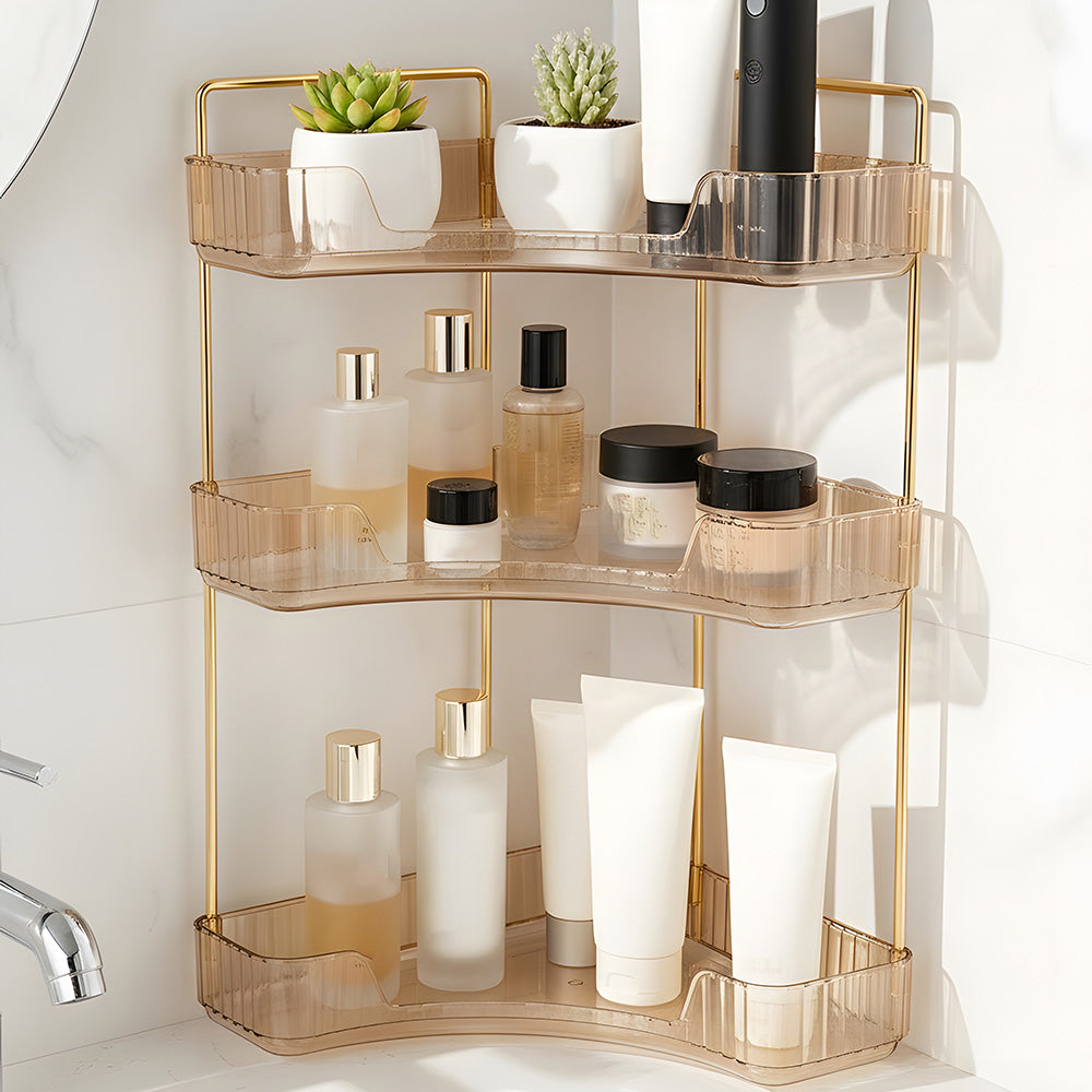 This corner bathroom counter organiser features a sleek amber-transparent body with gold-finished frames, offering a modern, luxurious look that elevates any space. Its three-tier open design allows clear visibility and easy access, keeping cosmetics, perfumes, lipsticks, brushes, soap, towels, and more neatly organised. Varying shelf heights accommodate bottles of all sizes even tall ones without hassle. The modular structure can be easily disassembled and reconfigured to suit your needs. Perfect for bathrooms, vanities, or bedrooms, this versatile organiser combines style and functionality for clutter-free everyday living.