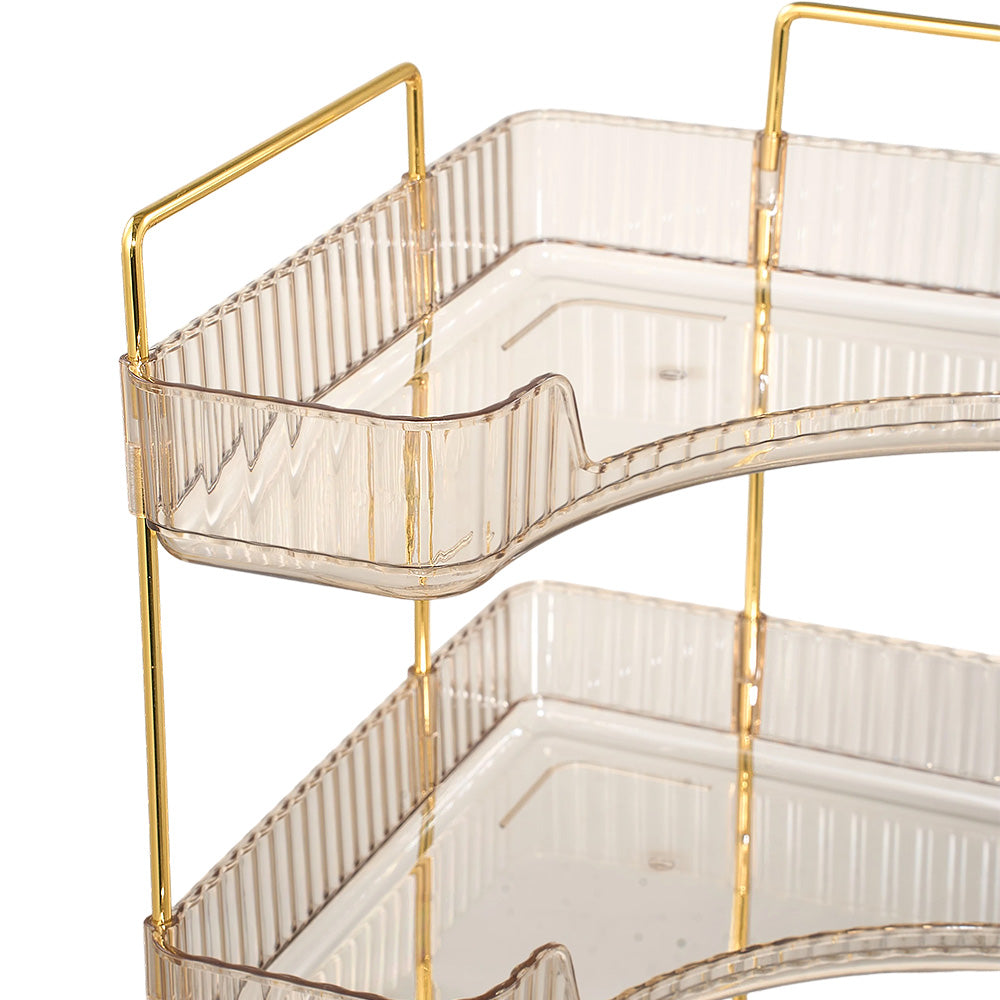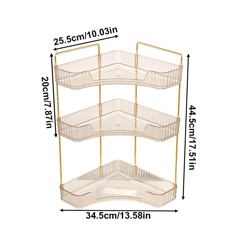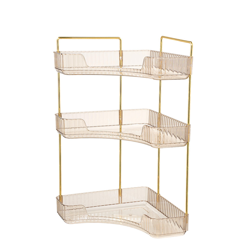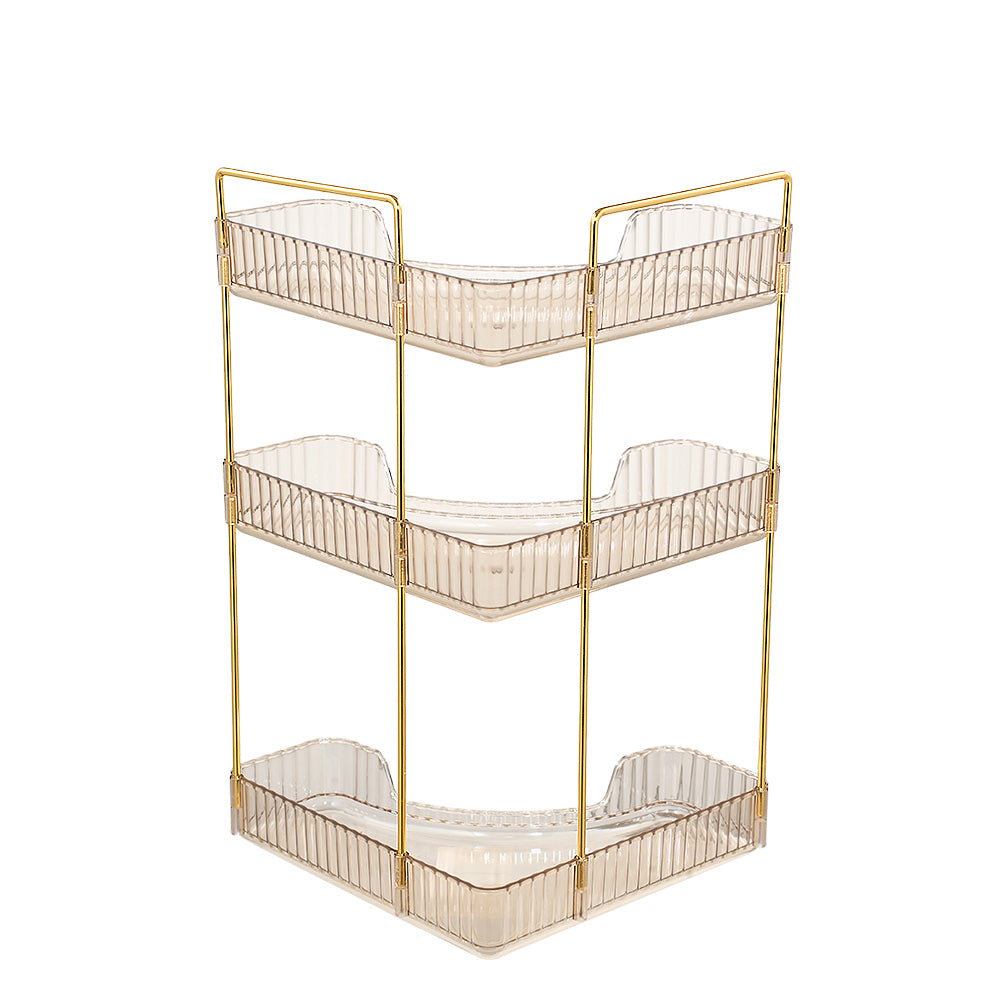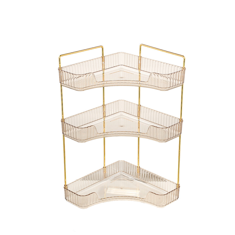 This corner bathroom counter organiser features a sleek amber-transparent body with gold-finished frames, offering a modern, luxurious look that elevates any space. Its three-tier open design allows clear visibility and easy access, keeping cosmetics, perfumes, lipsticks, brushes, soap, towels, and more neatly organised. Varying shelf heights accommodate bottles of all sizes even tall ones without hassle. The modular structure can be easily disassembled and reconfigured to suit your needs. Perfect for bathrooms, vanities, or bedrooms, this versatile organiser combines style and functionality for clutter-free everyday living.