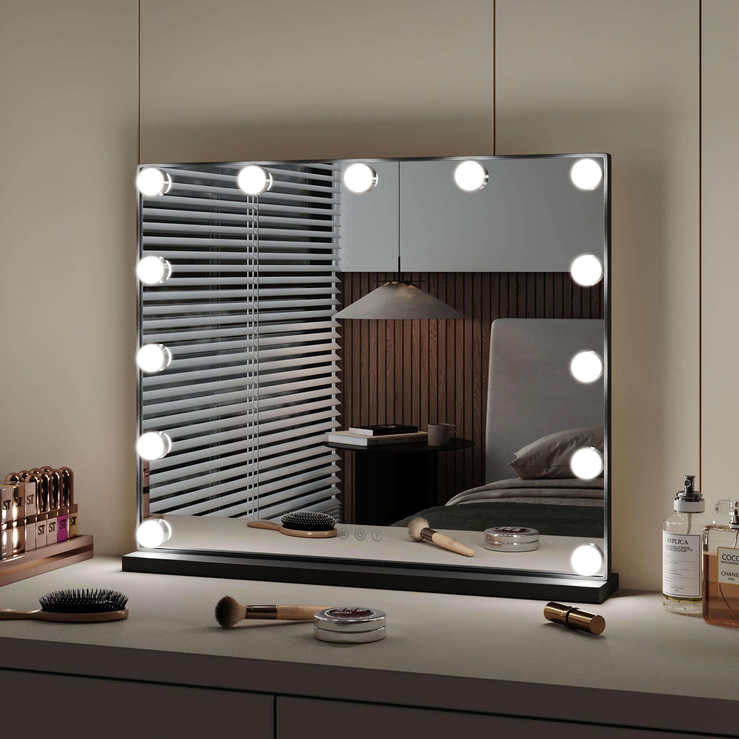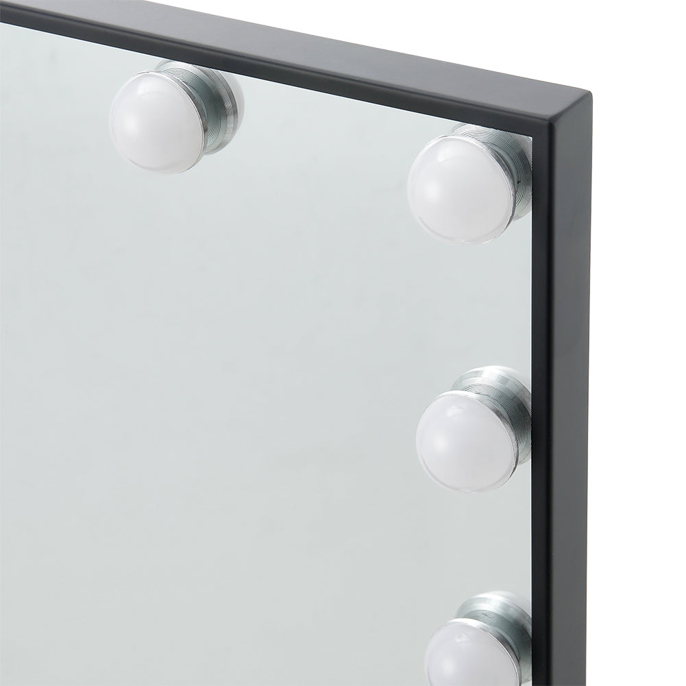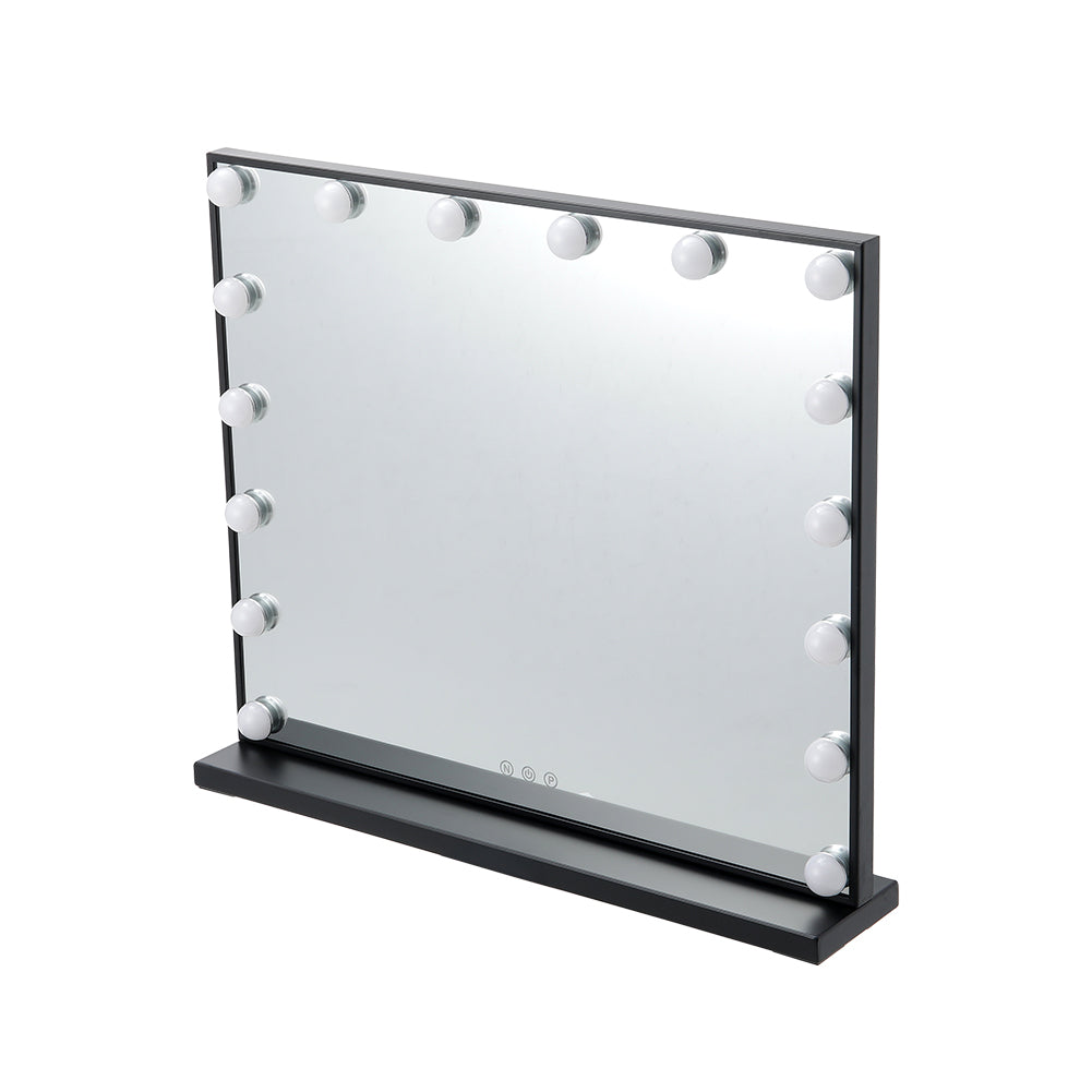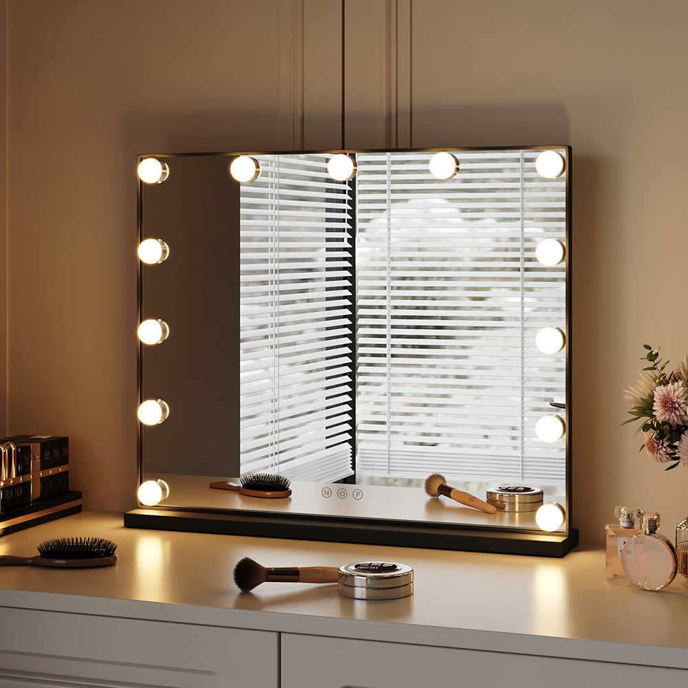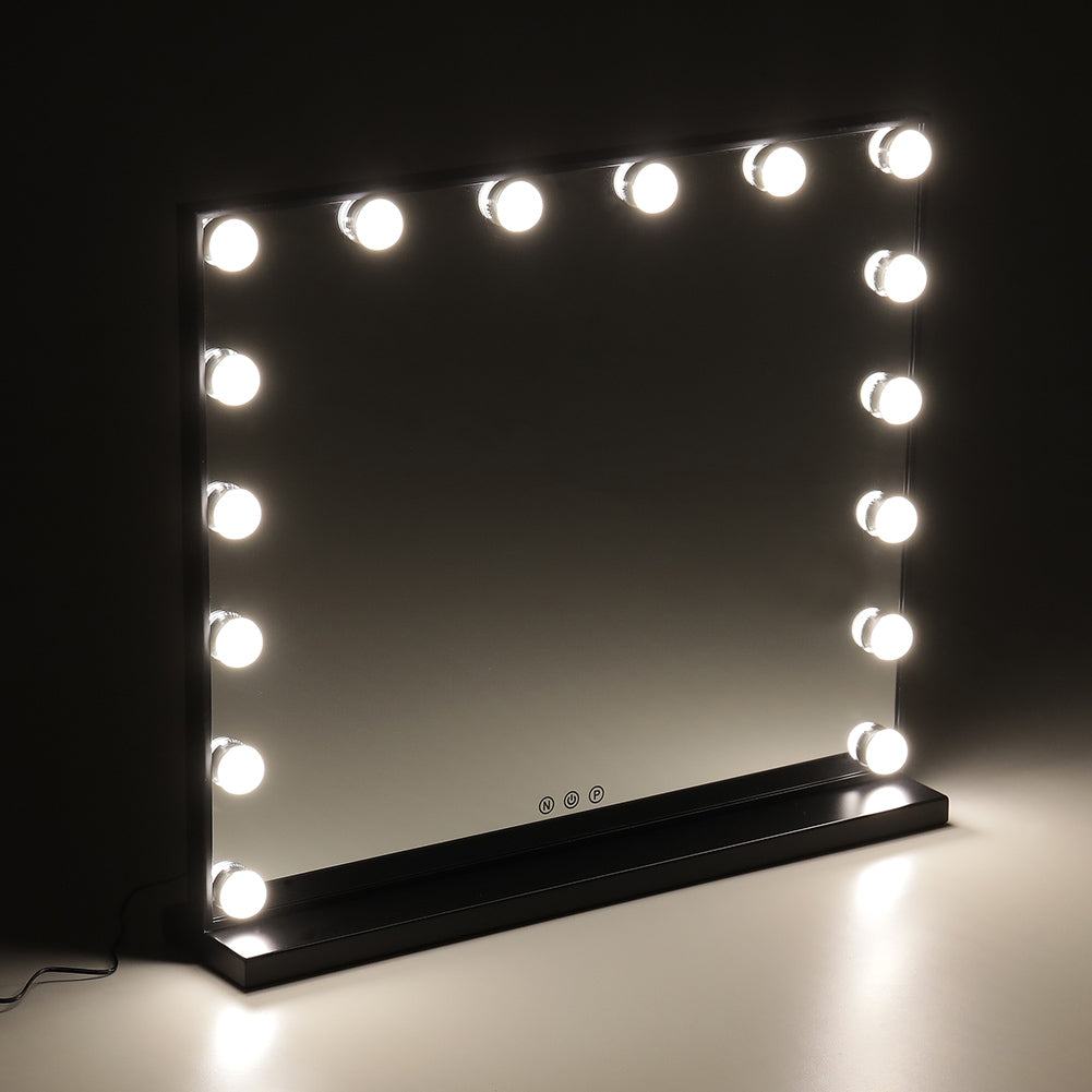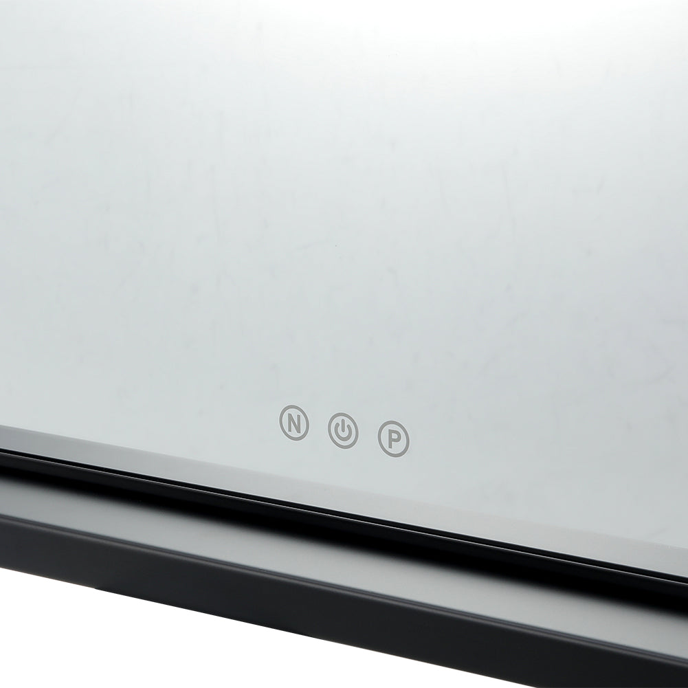 Elevate your daily makeup routine and add an elegant touch to your bedroom decor with our Smart LED Makeup Mirror. This mirror not only provides ample space for full-view makeup application but also enhances clarity with its LED lights, ensuring clear and bright illumination without being harsh on your eyes. Featuring a smart sensor screen, this mirror allows you to adjust the color temperature and brightness according to your preferences, ensuring optimal lighting for flawless makeup application. The sleek and stylish design, with a black metal frame, adds a touch of elegance to any decor, making it a versatile addition to your space.