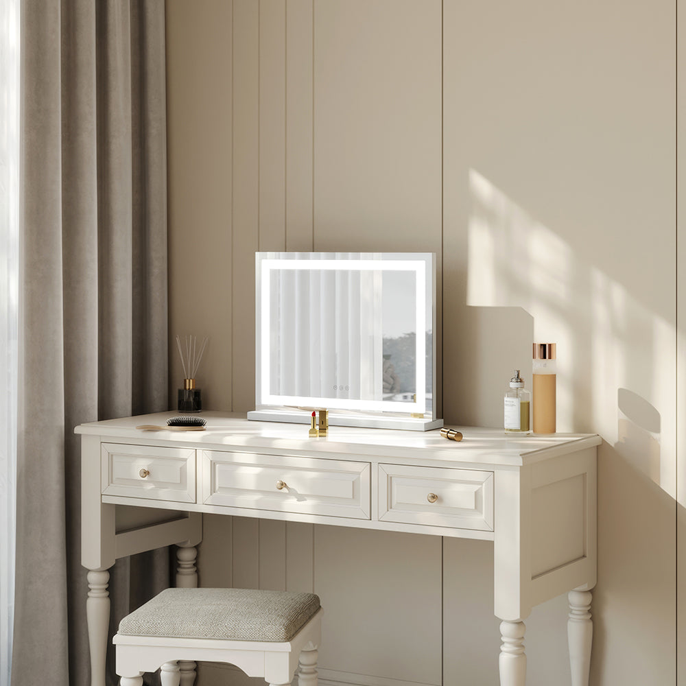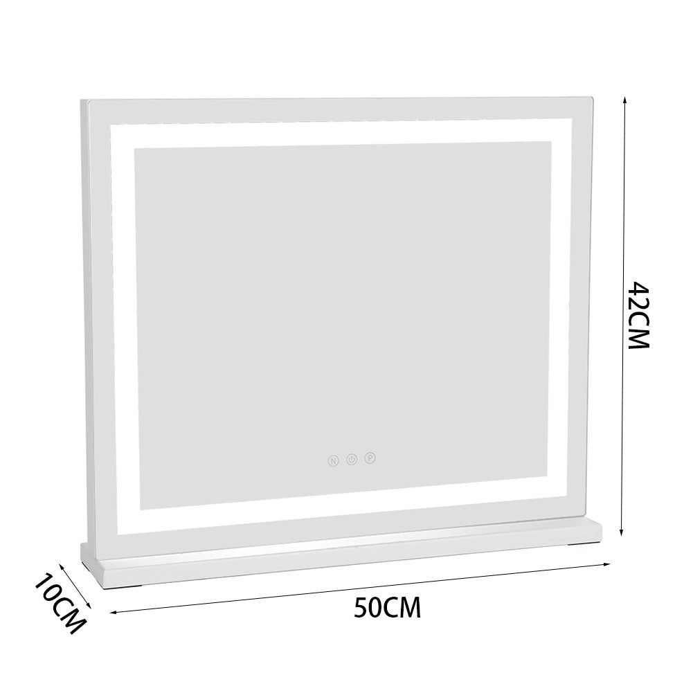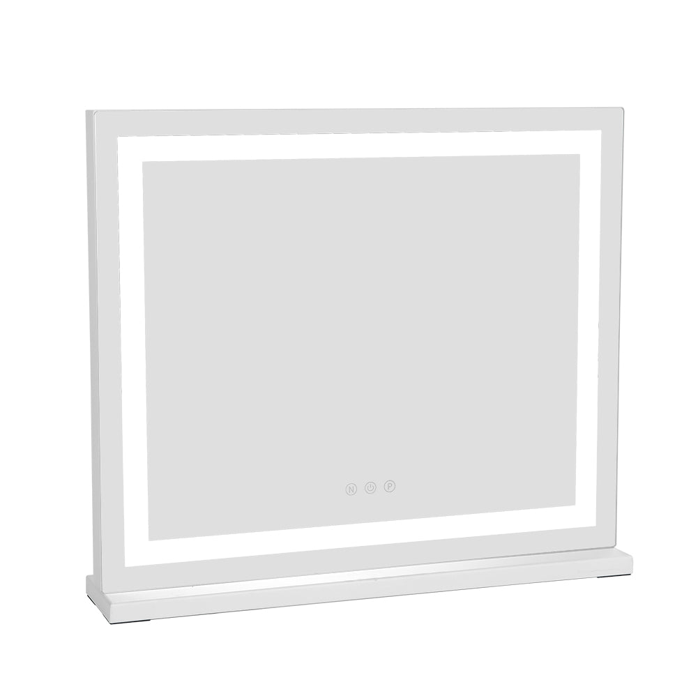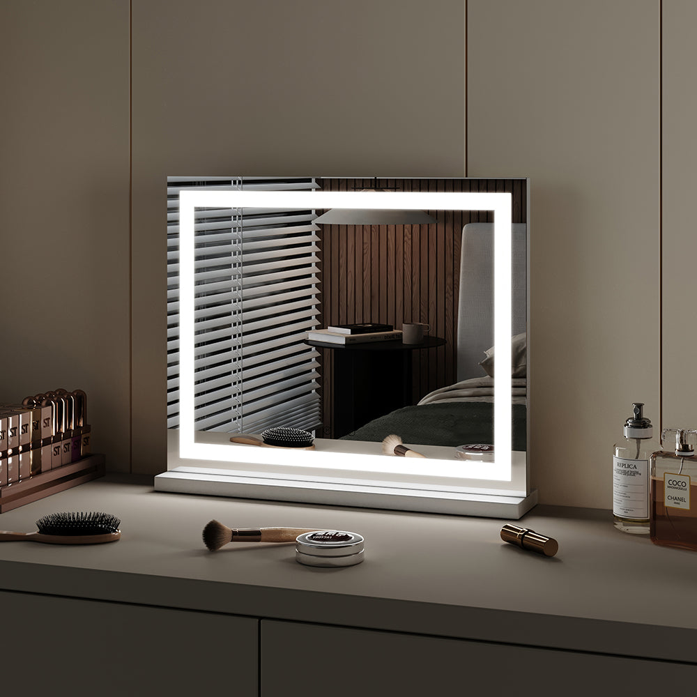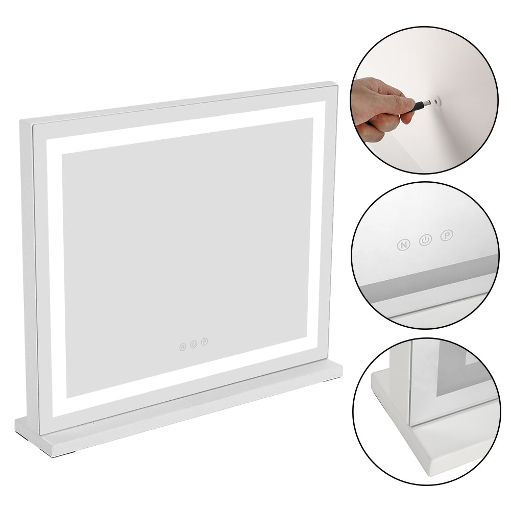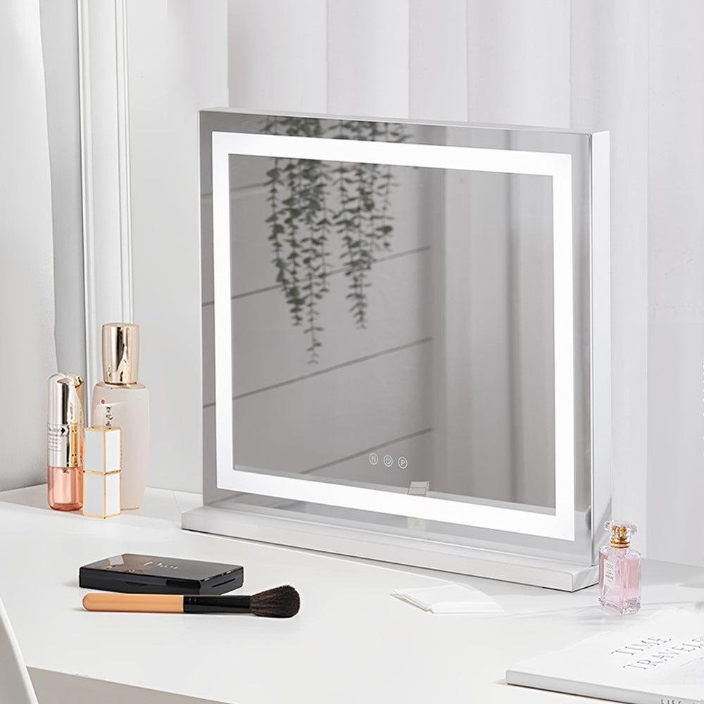Transform your dressing space into a glamorous Hollywood-inspired haven with our Vanity Mirror. Encircled by a permanent LED light strip, this mirror offers intelligent touch control for adjusting brightness, providing three lighting settings: cold white, warm white, and warm. Whether for makeup application, skincare routines, or simply admiring your reflection, this mirror ensures you have the perfect illumination every time. With its sturdy base, you can place it directly on a table or countertop according to your preference, bringing a touch of elegance and confidence to your daily beauty rituals.