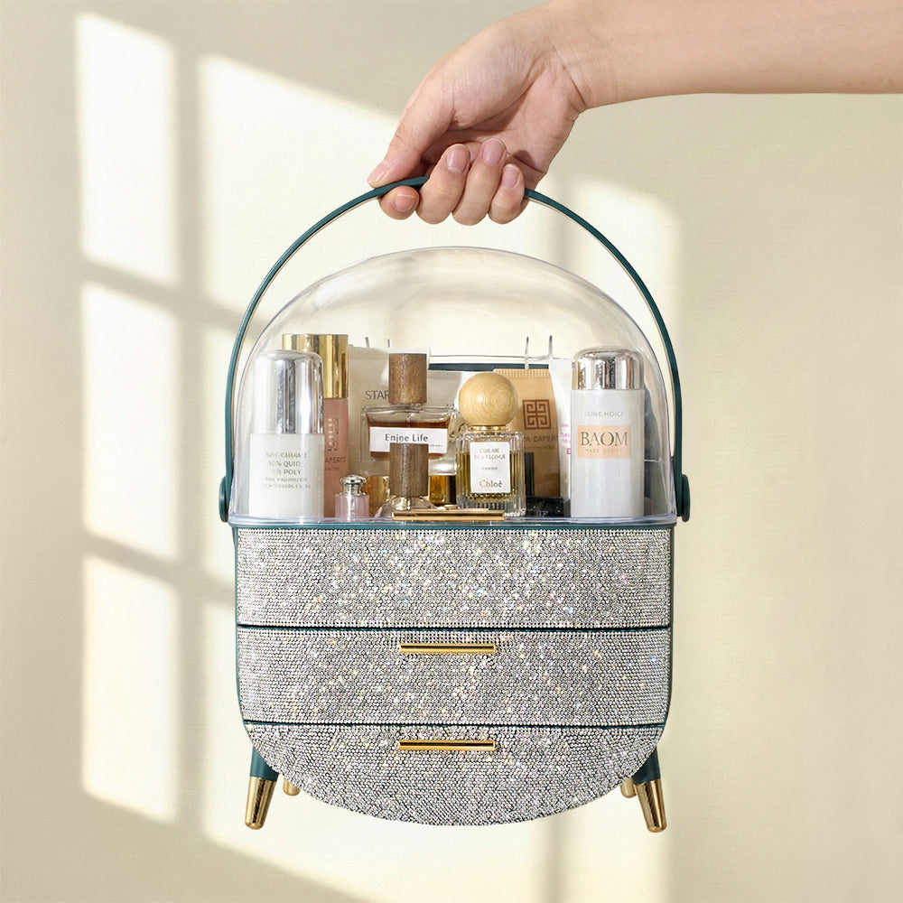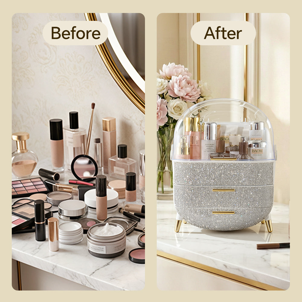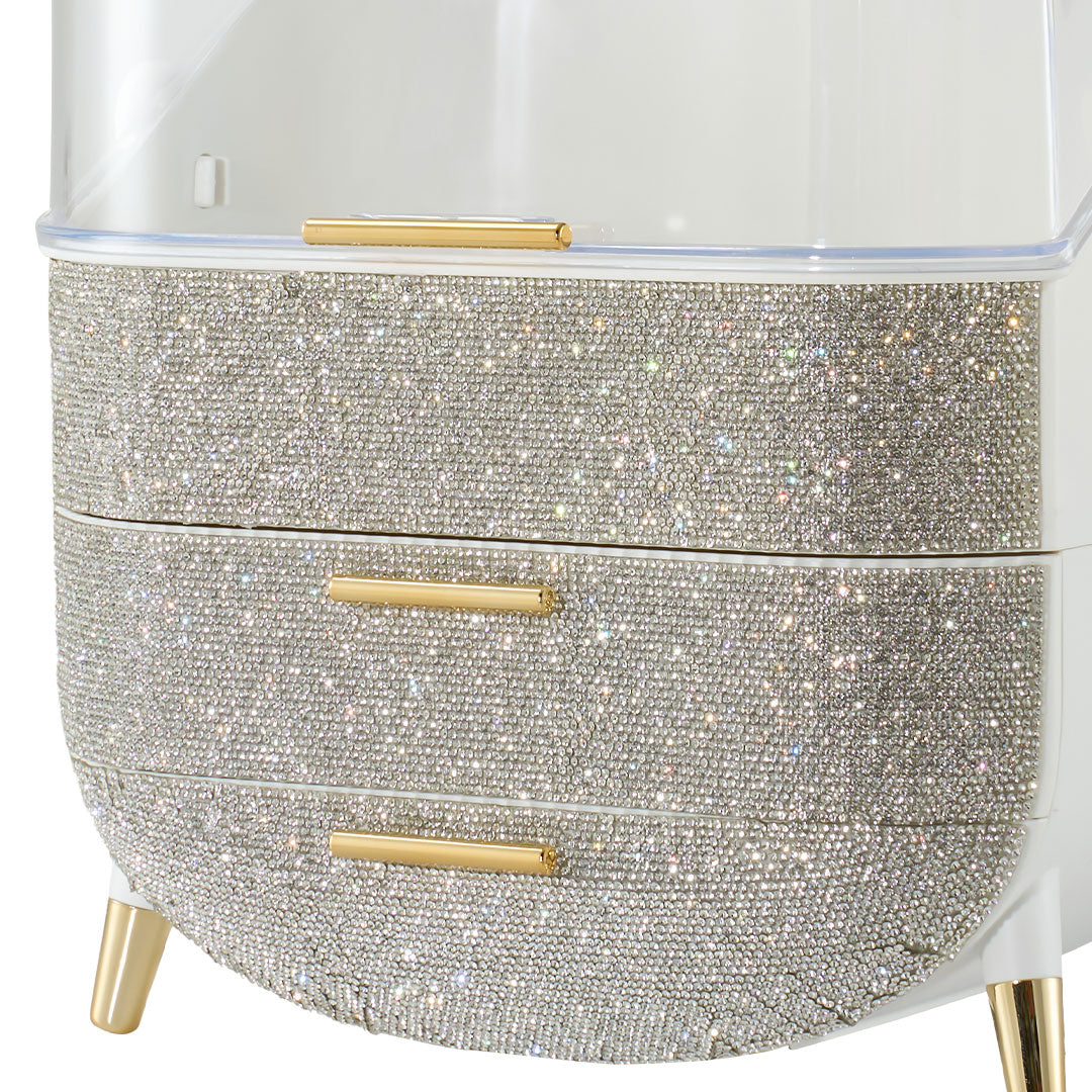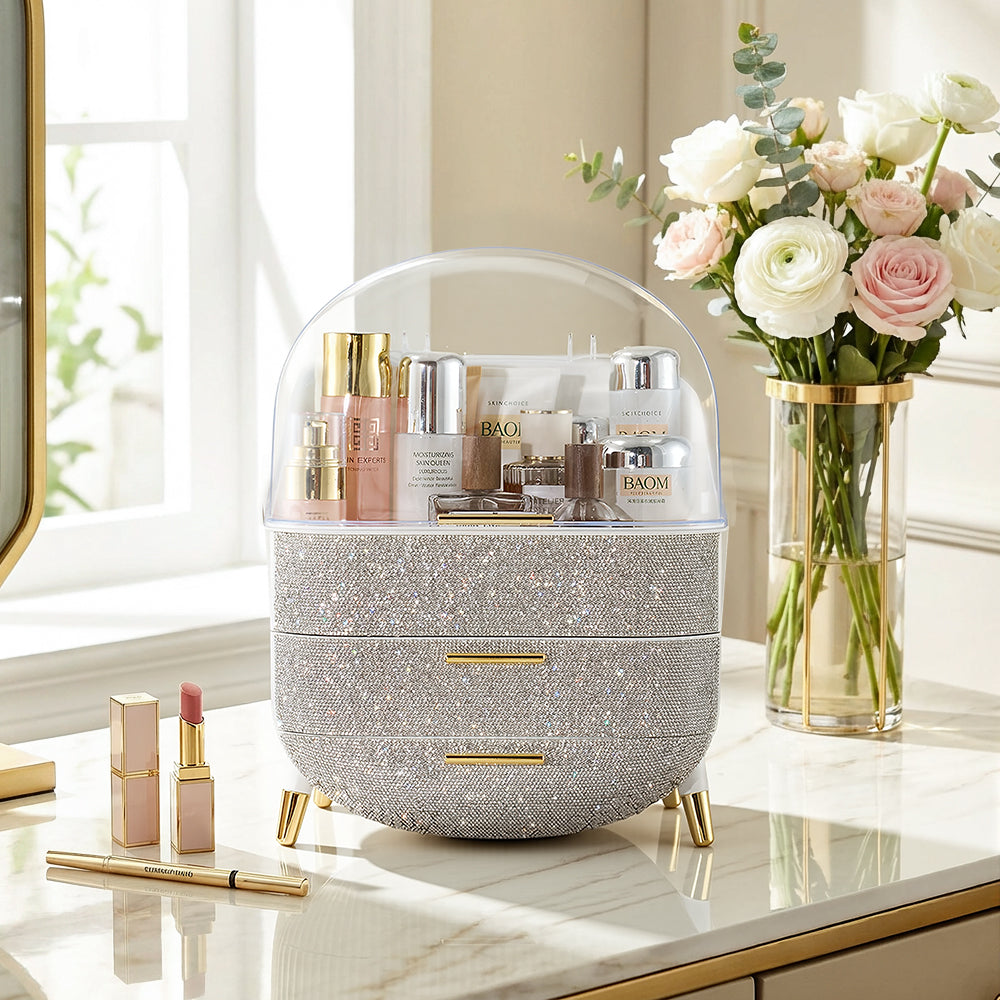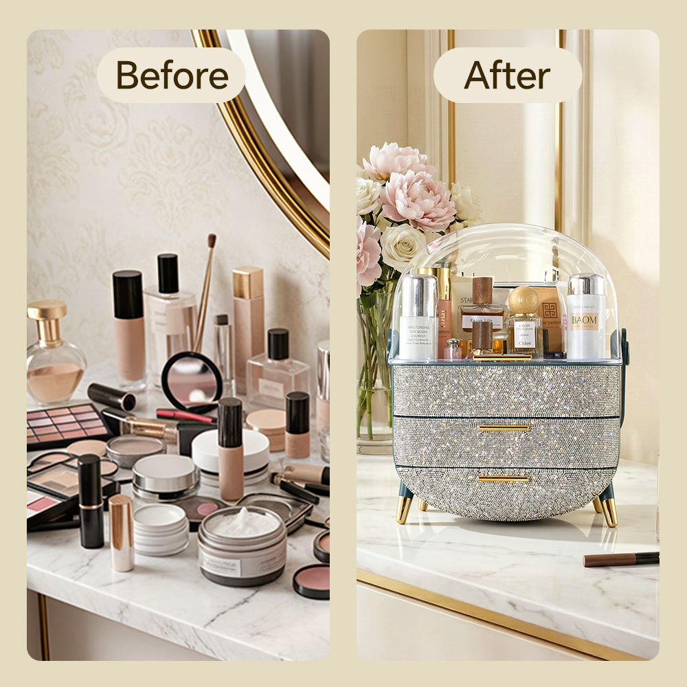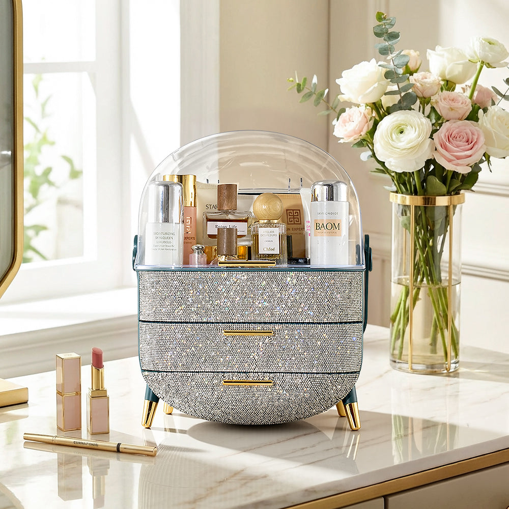 This makeup storage box, adorned with sparkling rhinestones on the surface, seamlessly blends functionality with aesthetic appeal. The top compartment offers ample storage space for items like moisturizers, creams, foundations, and perfumes, helping keep your desktop tidy. Two separate drawers at the bottom provide additional organized storage, ideal for categorizing lipsticks, eyebrow pencils, makeup brushes, and more. The transparent top cover not only allows clear visibility of the contents but also effectively protects against dust. Additionally, each layer is equipped with delicate handles for effortless access.