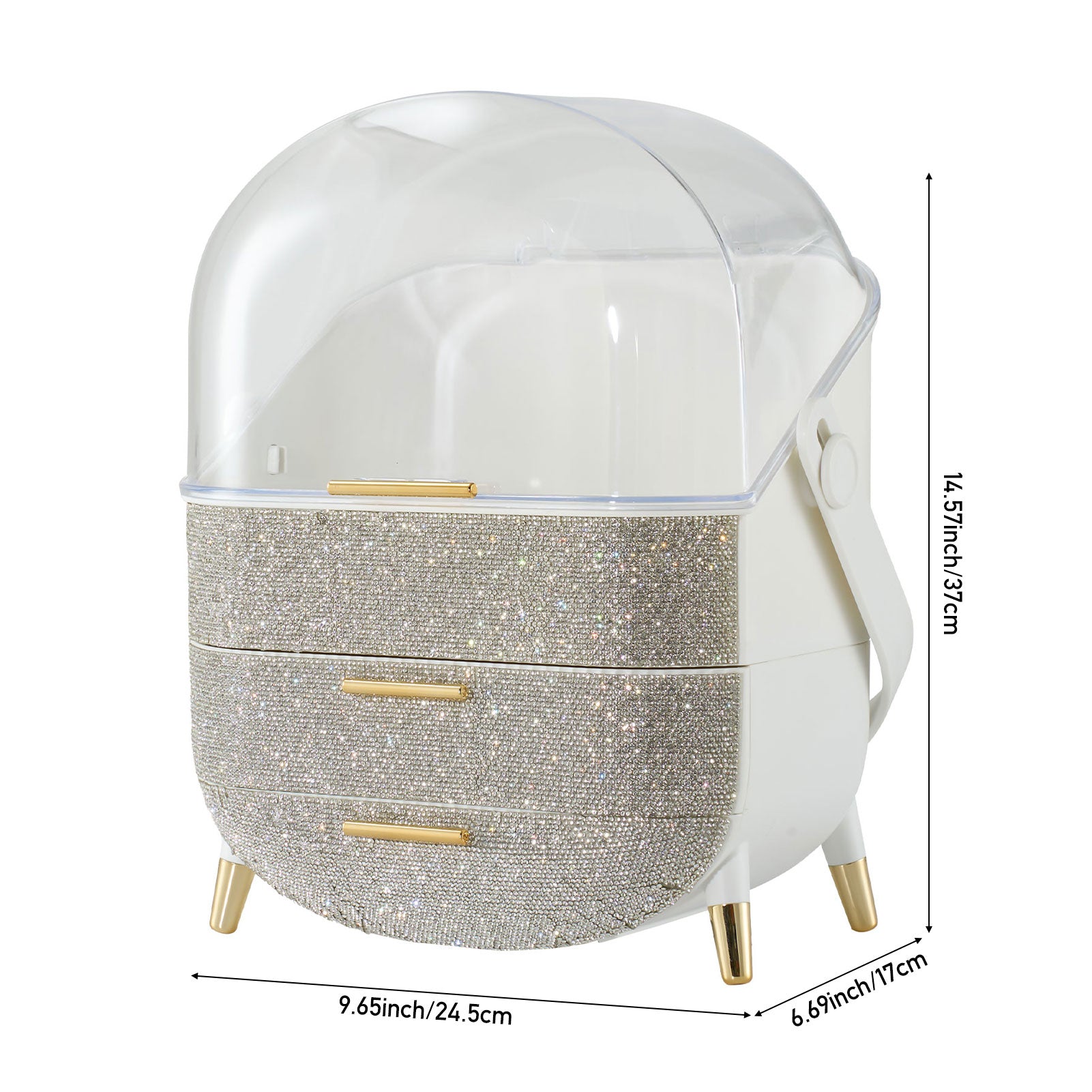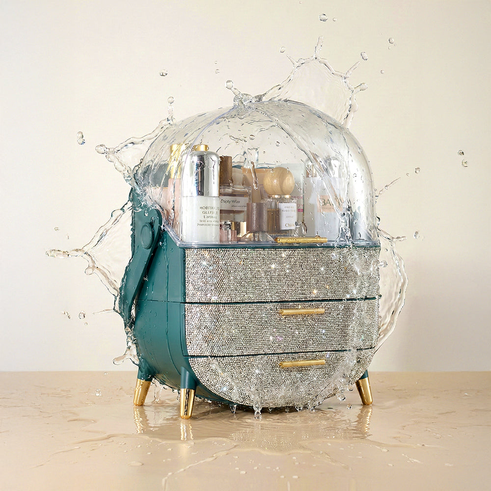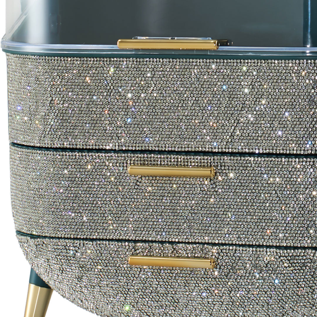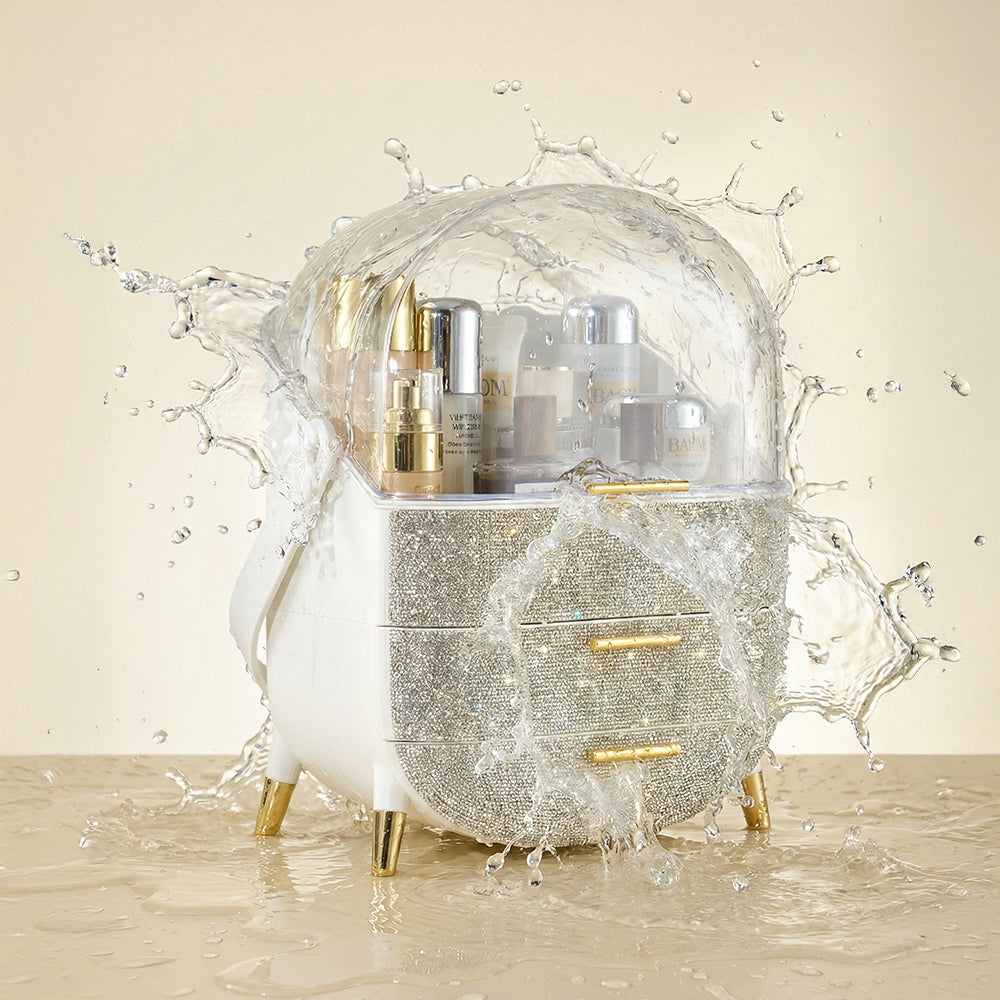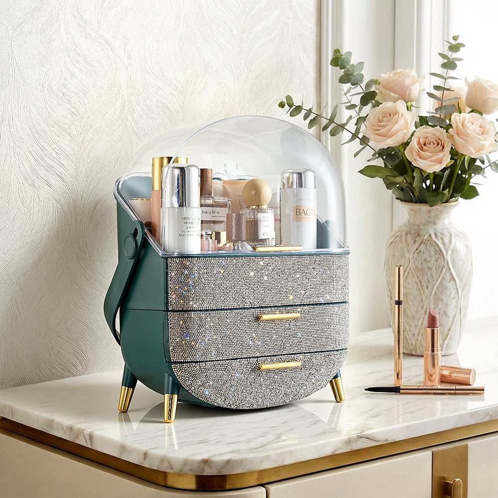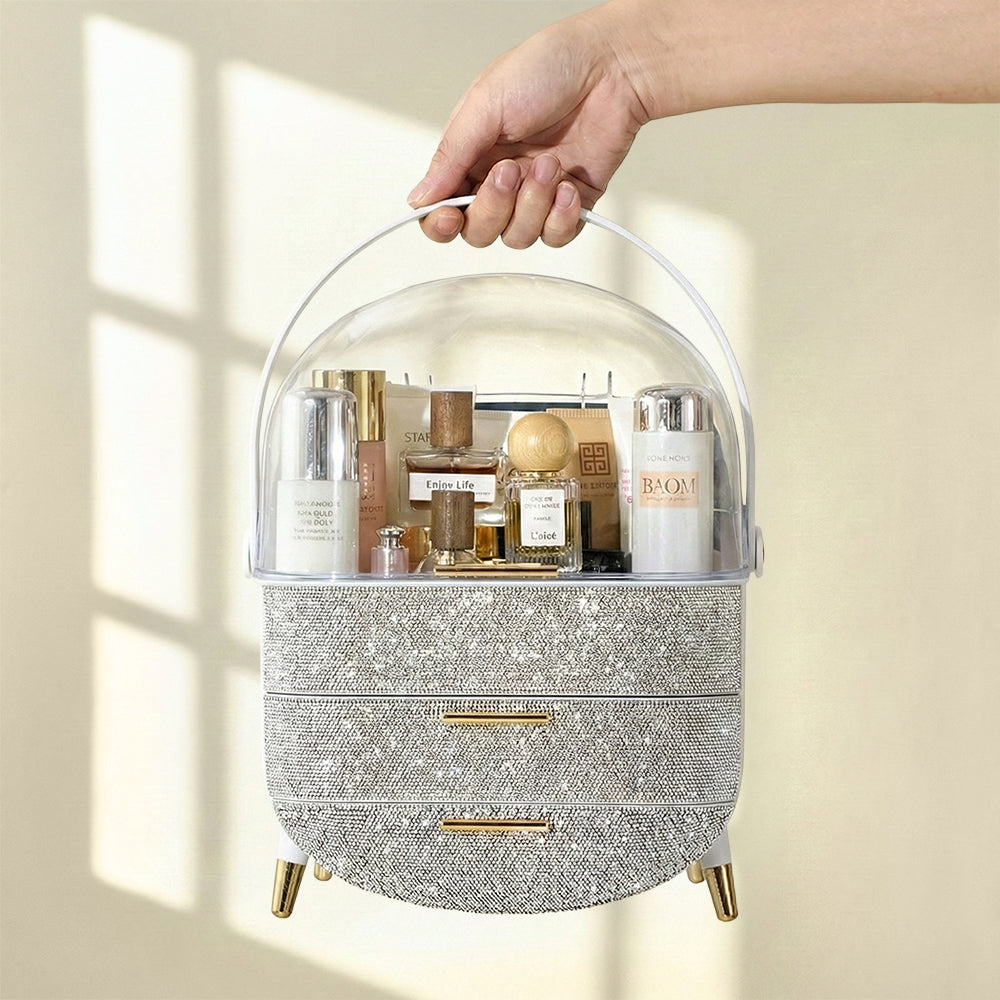 This makeup storage box, adorned with sparkling rhinestones on the surface, seamlessly blends functionality with aesthetic appeal. The top compartment offers ample storage space for items like moisturizers, creams, foundations, and perfumes, helping keep your desktop tidy. Two separate drawers at the bottom provide additional organized storage, ideal for categorizing lipsticks, eyebrow pencils, makeup brushes, and more. The transparent top cover not only allows clear visibility of the contents but also effectively protects against dust. Additionally, each layer is equipped with delicate handles for effortless access.