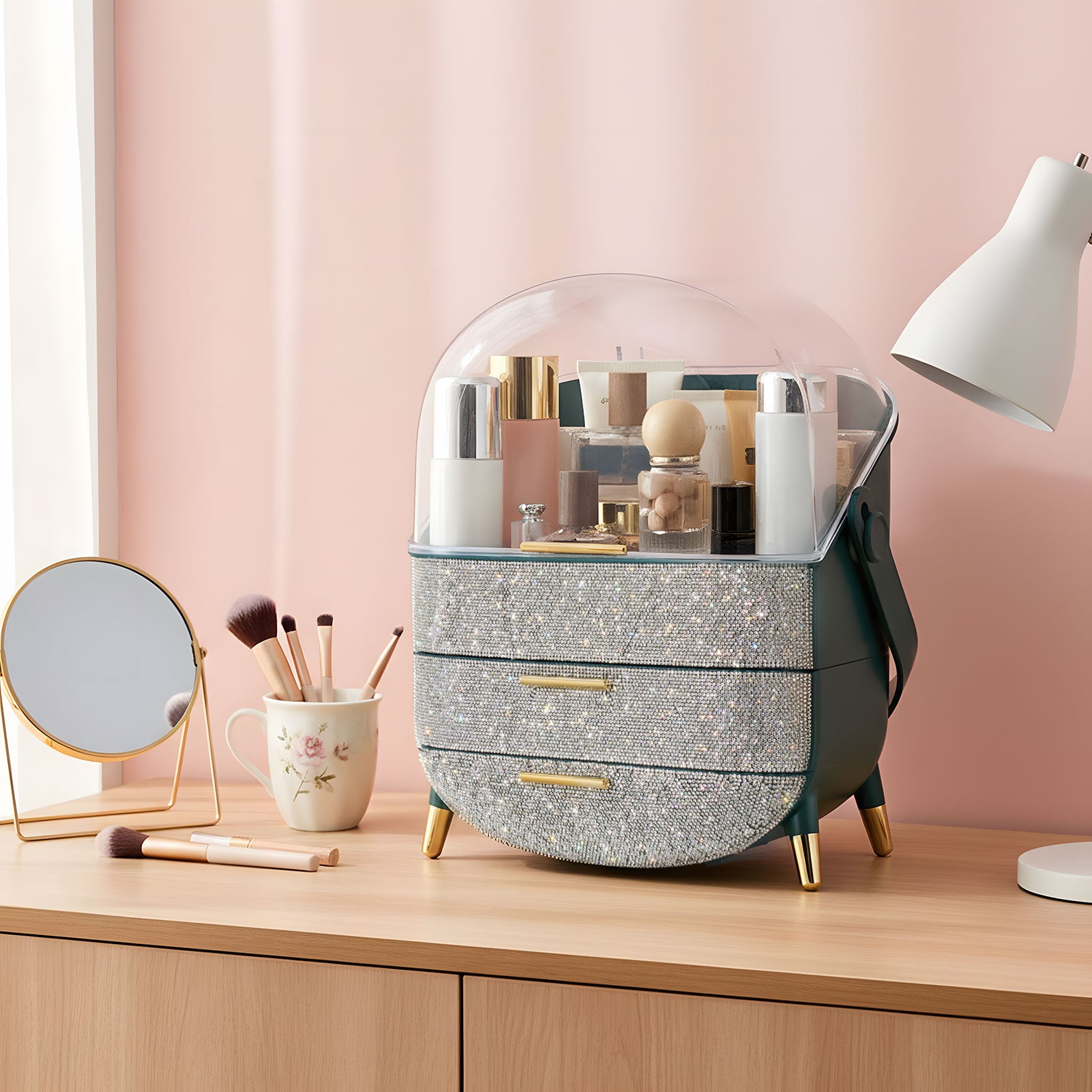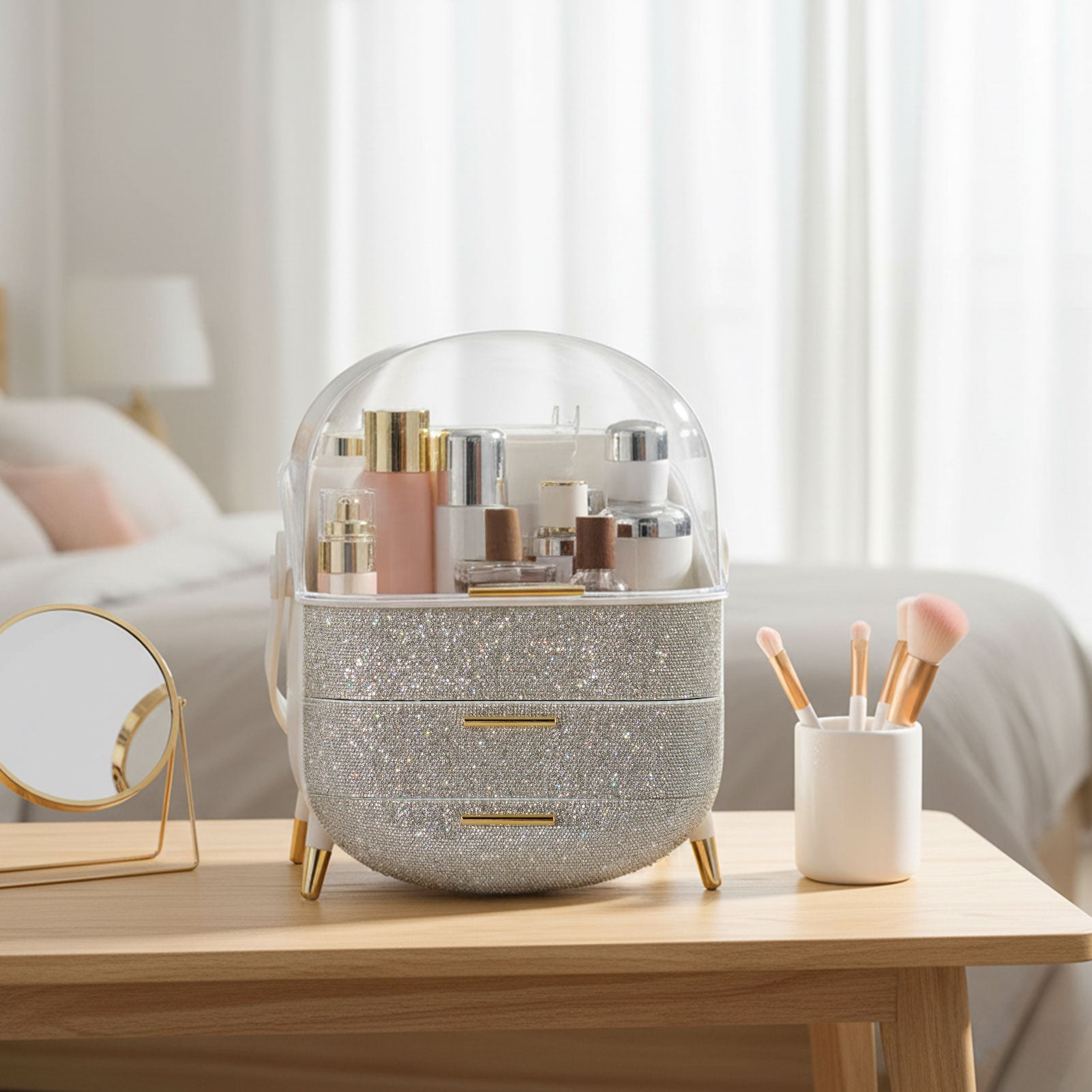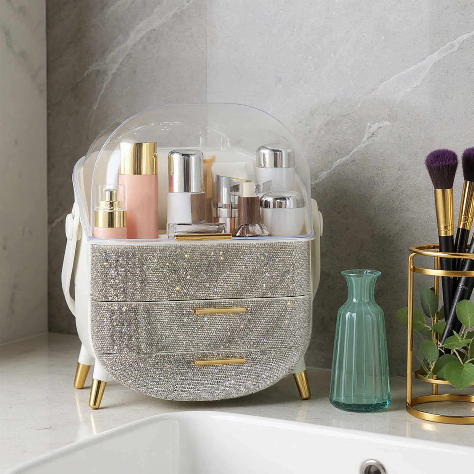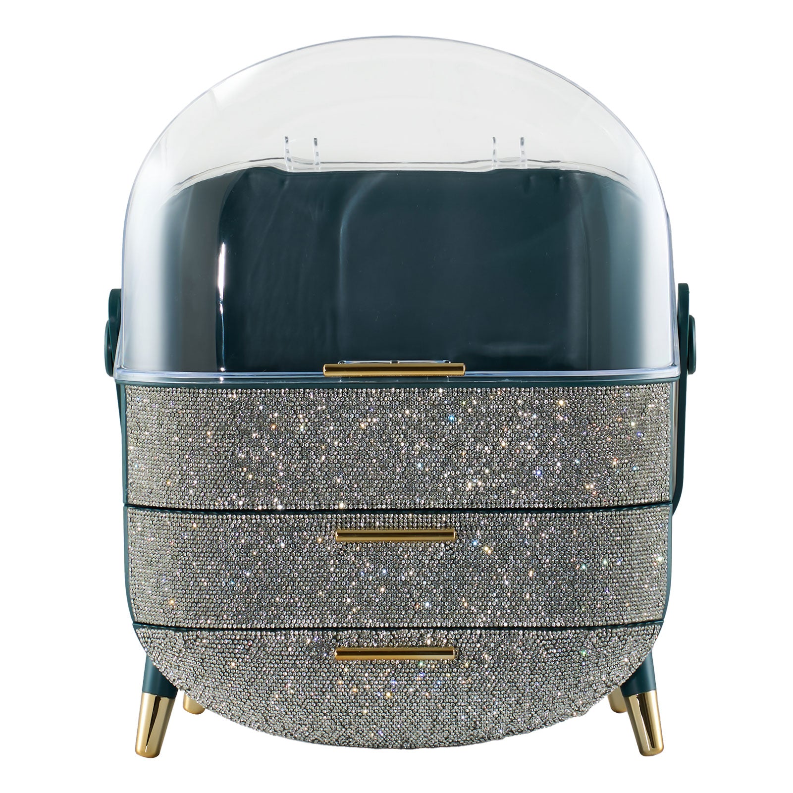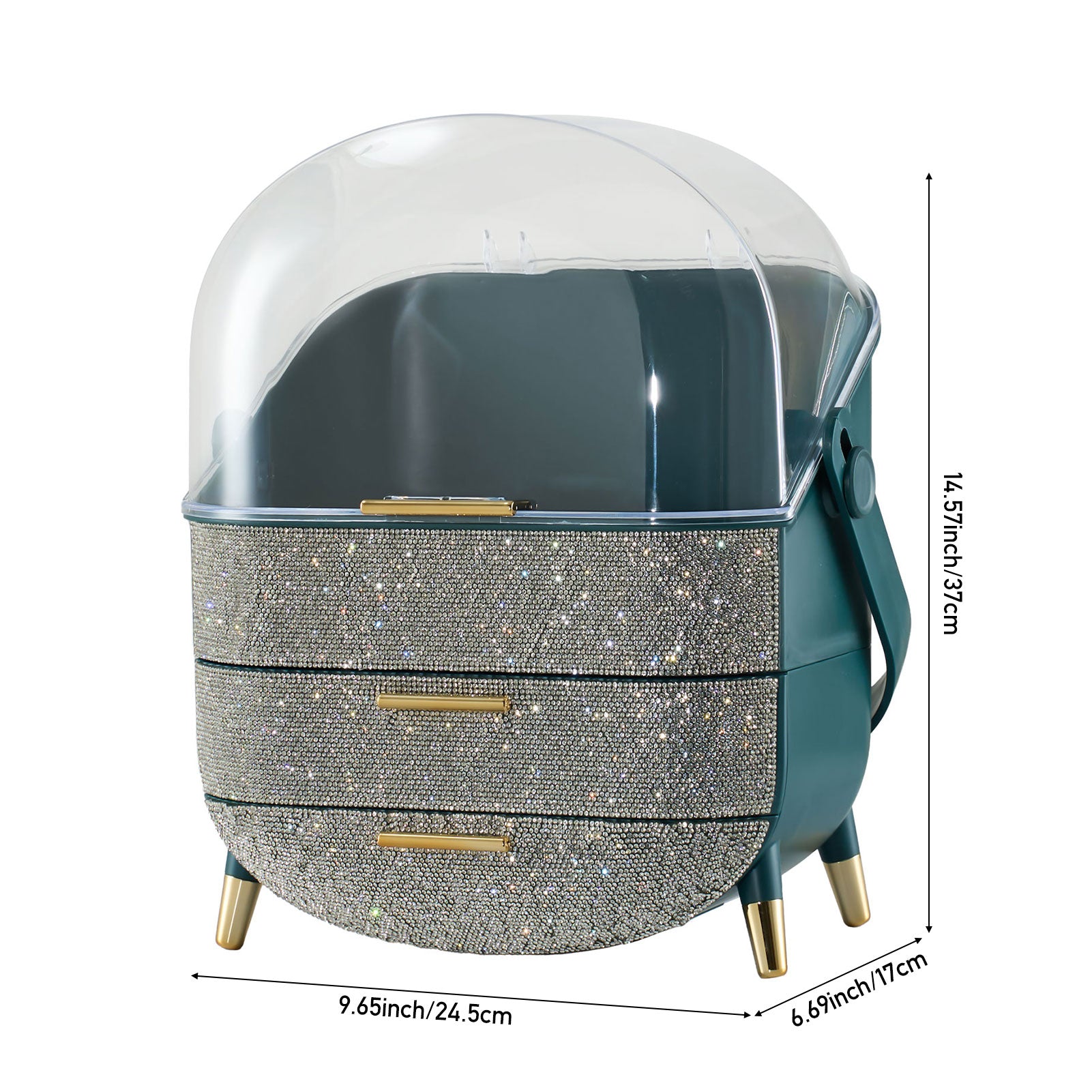 This makeup storage box, adorned with sparkling rhinestones on the surface, seamlessly blends functionality with aesthetic appeal. The top compartment offers ample storage space for items like moisturizers, creams, foundations, and perfumes, helping keep your desktop tidy. Two separate drawers at the bottom provide additional organized storage, ideal for categorizing lipsticks, eyebrow pencils, makeup brushes, and more. The transparent top cover not only allows clear visibility of the contents but also effectively protects against dust. Additionally, each layer is equipped with delicate handles for effortless access.