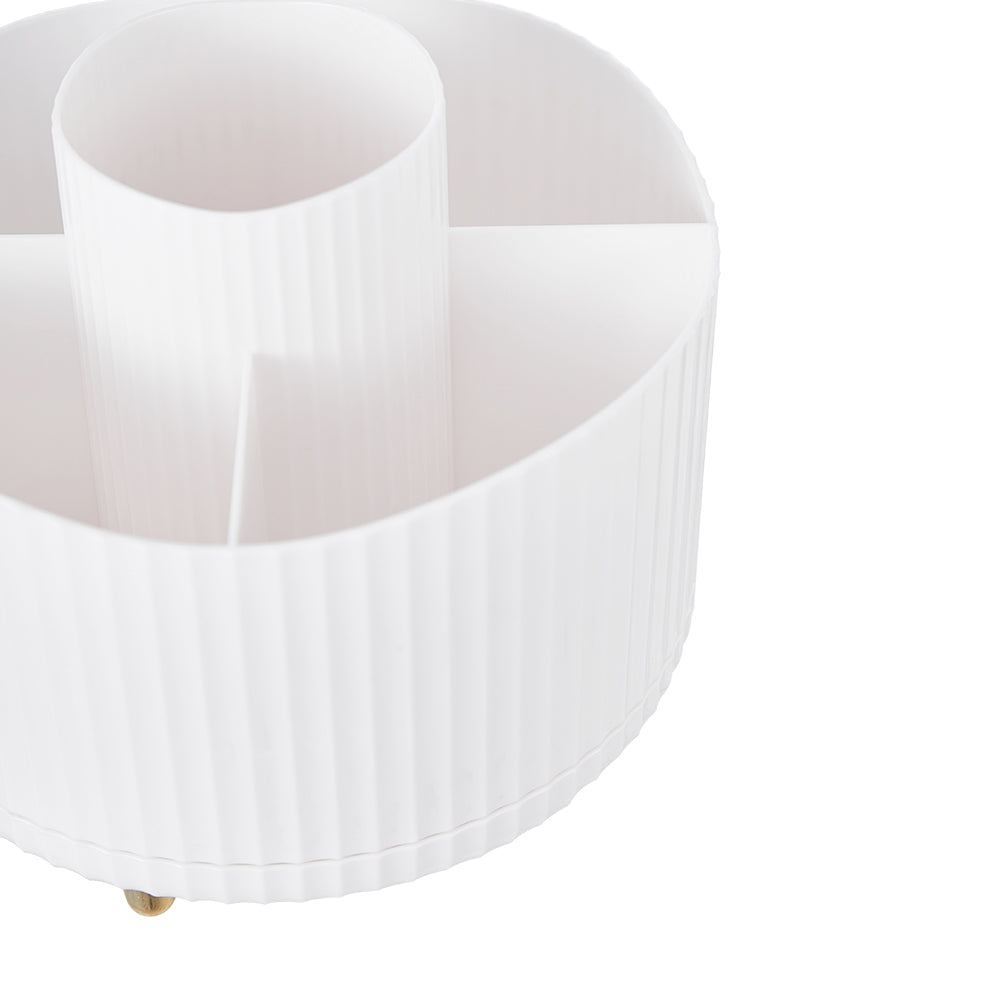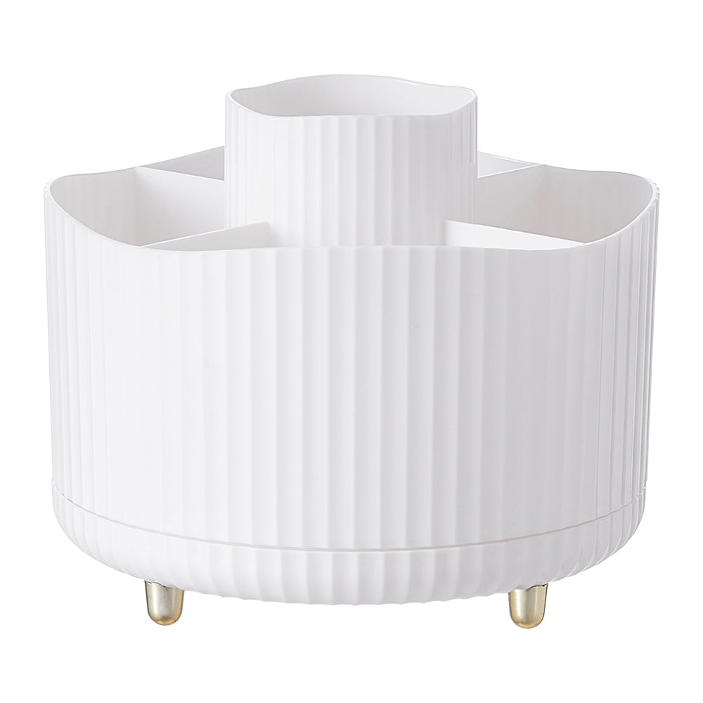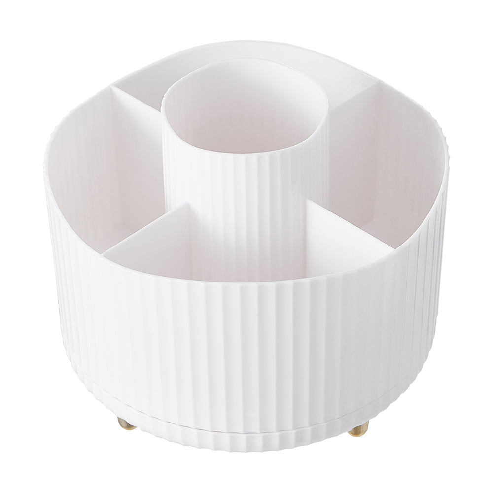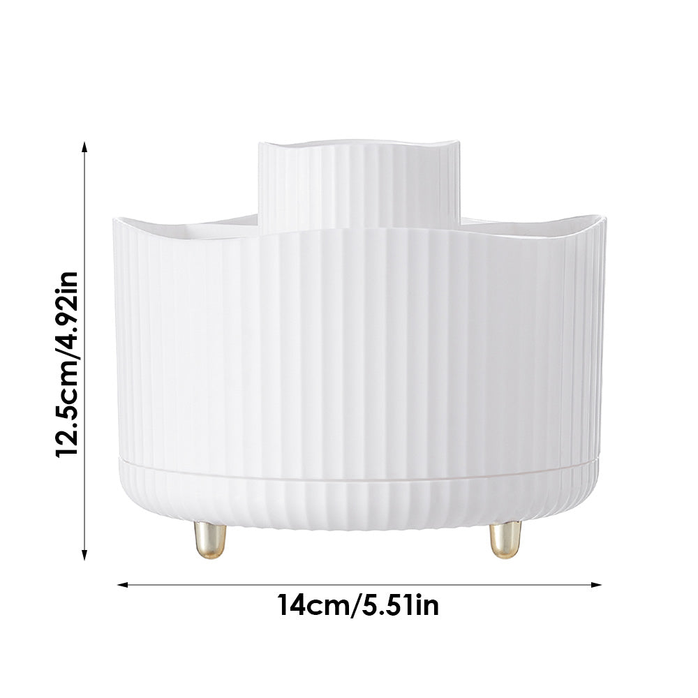 Designed with 5 compartments, this organizer keeps your makeup essentials in a circle, making it a practical and stylish solution to your dressing table. The holder features a fun rotating mechanism, allowing you to access your essentials with ease. Not limited to makeup brushes, it is also a great fit for your lipsticks and nail polish. With a simple design, it makes a subtle showpiece as well.
