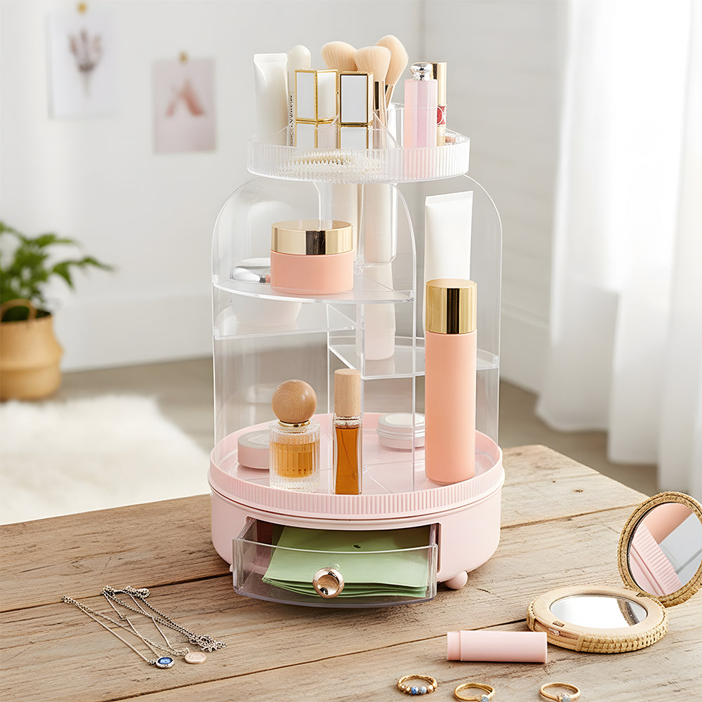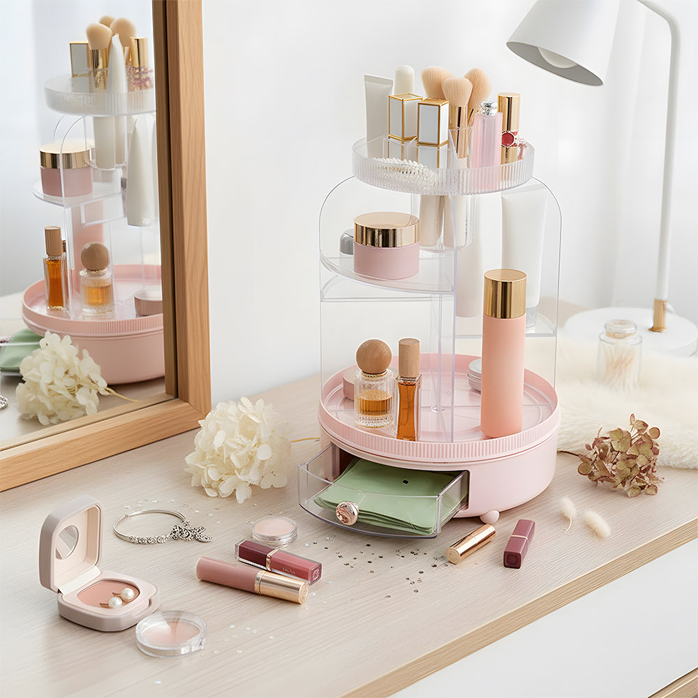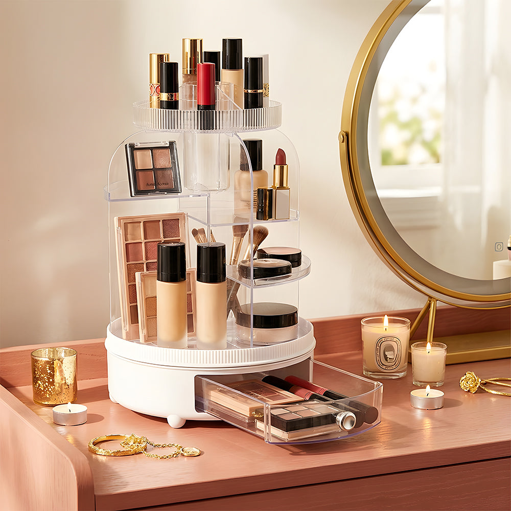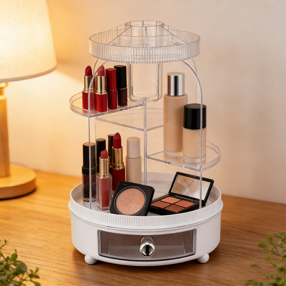 Bid farewell to clutter and chaos with this stylish storage organiser. A top tier with multiple small compartments neatly holds lipsticks and glosses in plain view. The multi-tiered layout efficiently accommodates a variety of cosmetic sizes, maximising storage potential. Meanwhile, a smooth 360° rotating base brings every item to your fingertips with a gentle spin. For added versatility, a pull-out drawer at the bottom keeps masks, earrings, or other loose accessories securely tucked away. Compact yet capacious, this organiser becomes an essential partner in your daily beauty routine.