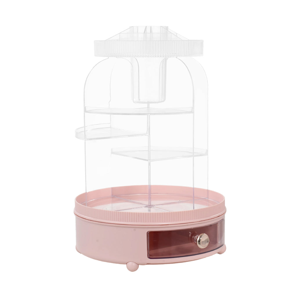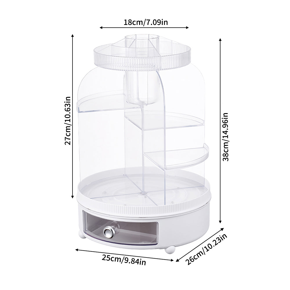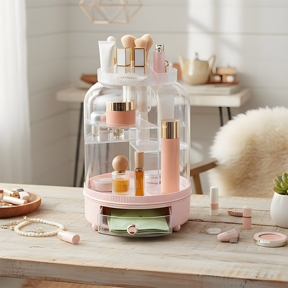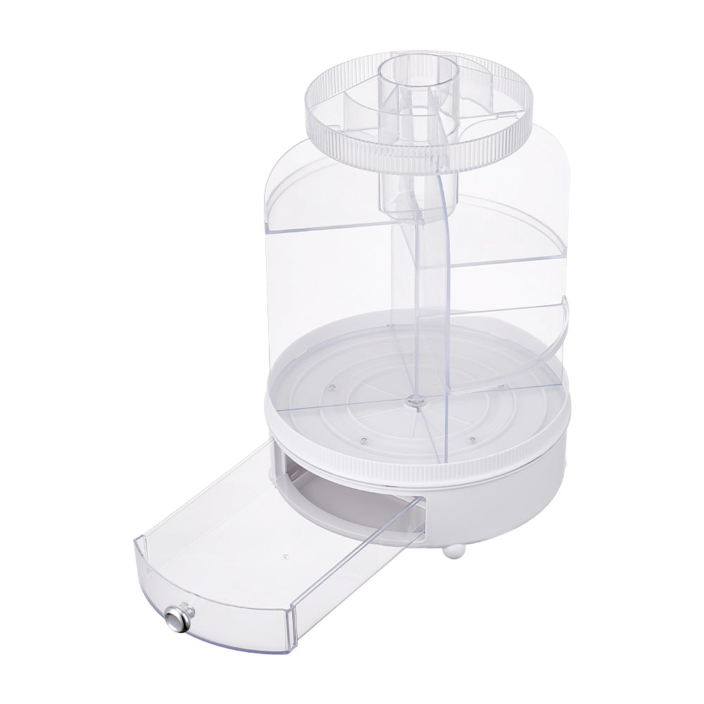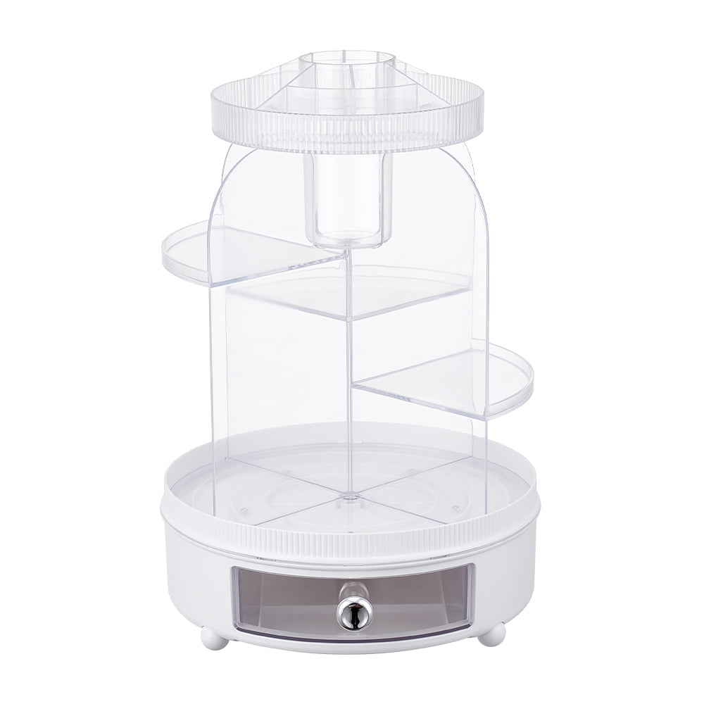 Bid farewell to clutter and chaos with this stylish storage organiser. A top tier with multiple small compartments neatly holds lipsticks and glosses in plain view. The multi-tiered layout efficiently accommodates a variety of cosmetic sizes, maximising storage potential. Meanwhile, a smooth 360° rotating base brings every item to your fingertips with a gentle spin. For added versatility, a pull-out drawer at the bottom keeps masks, earrings, or other loose accessories securely tucked away. Compact yet capacious, this organiser becomes an essential partner in your daily beauty routine.