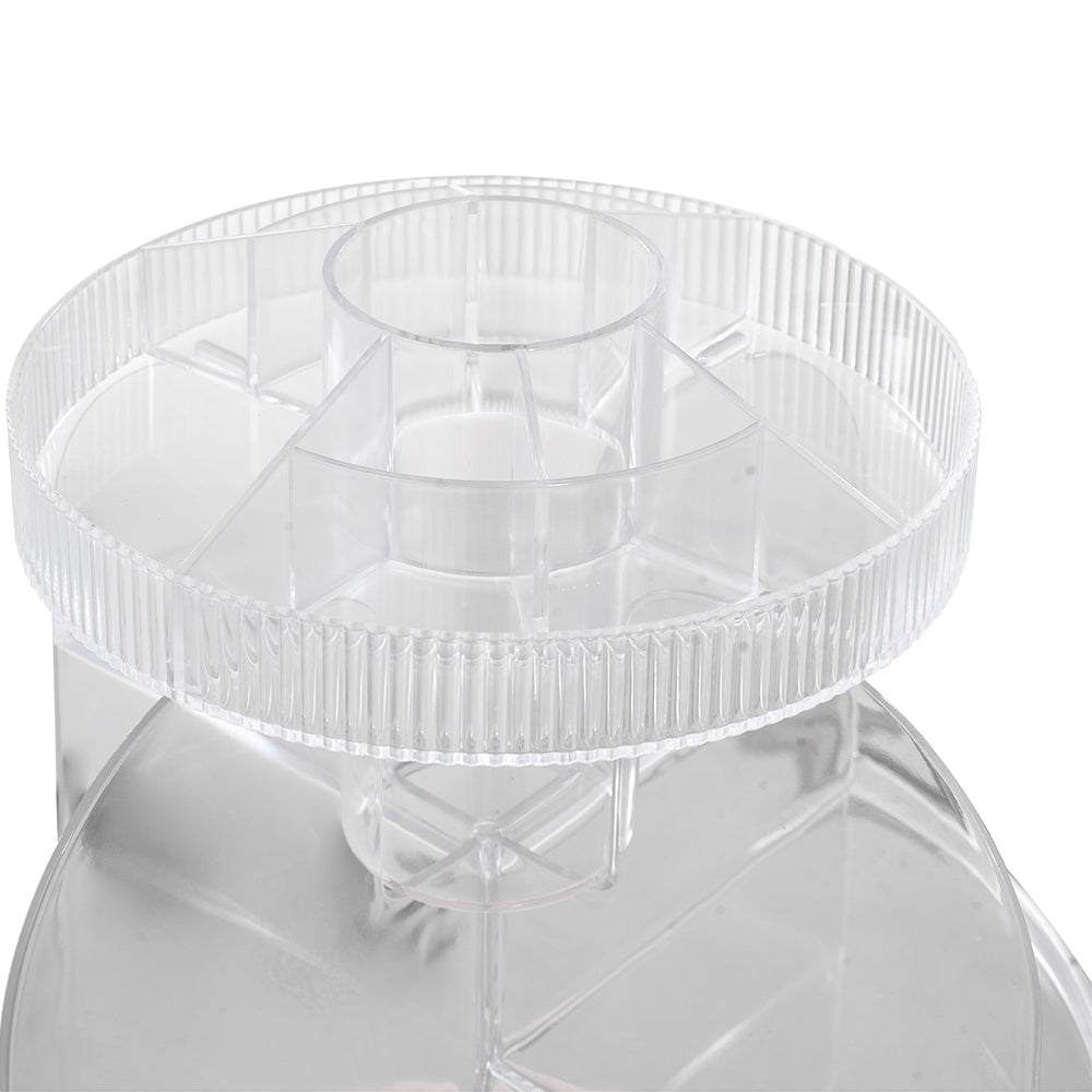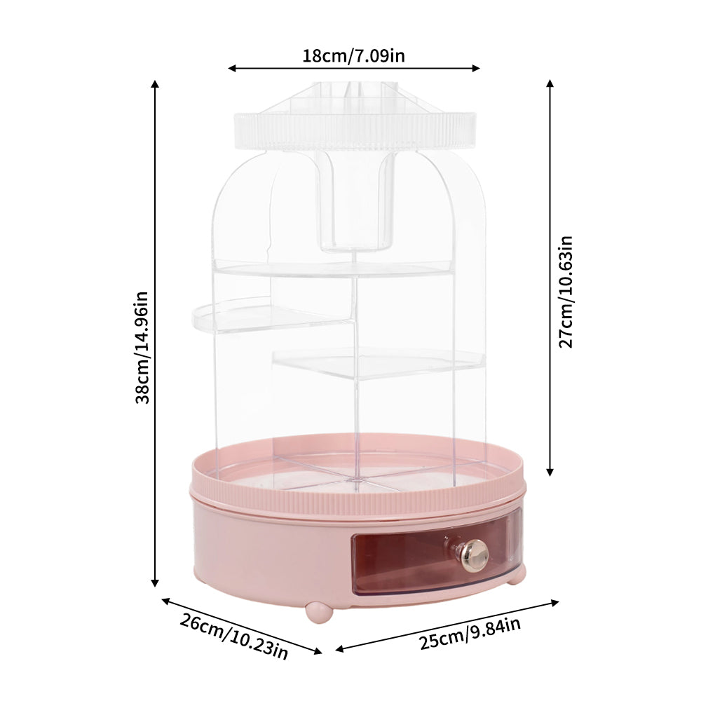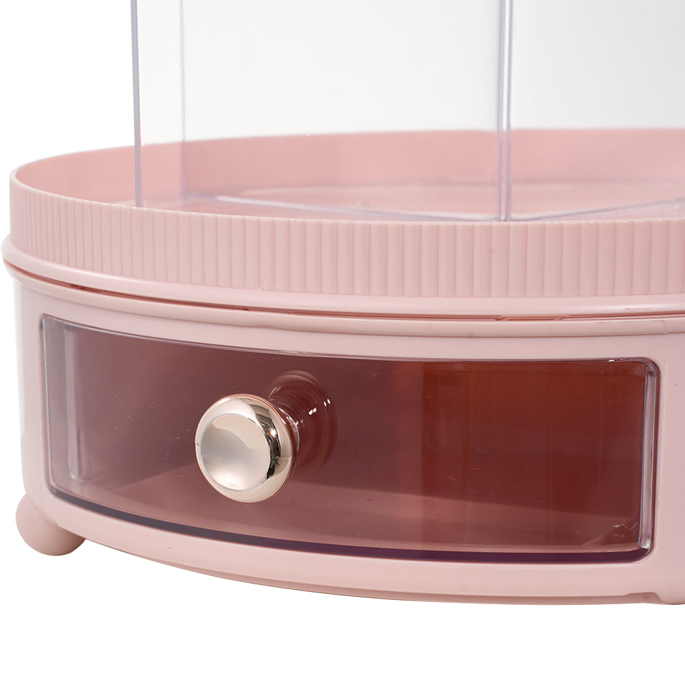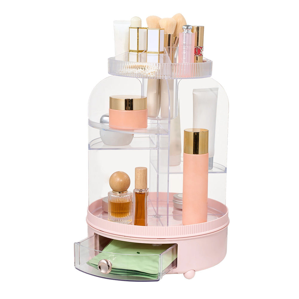 Bid farewell to clutter and chaos with this stylish storage organiser. A top tier with multiple small compartments neatly holds lipsticks and glosses in plain view. The multi-tiered layout efficiently accommodates a variety of cosmetic sizes, maximising storage potential. Meanwhile, a smooth 360° rotating base brings every item to your fingertips with a gentle spin. For added versatility, a pull-out drawer at the bottom keeps masks, earrings, or other loose accessories securely tucked away. Compact yet capacious, this organiser becomes an essential partner in your daily beauty routine.
