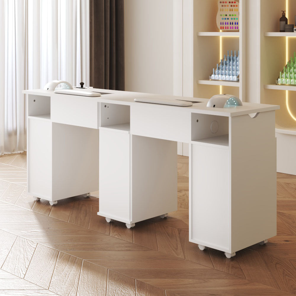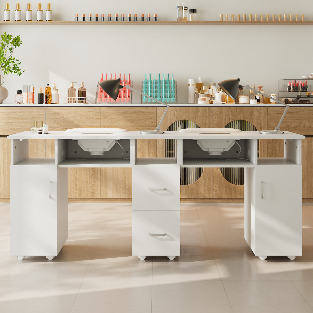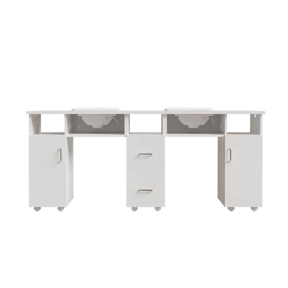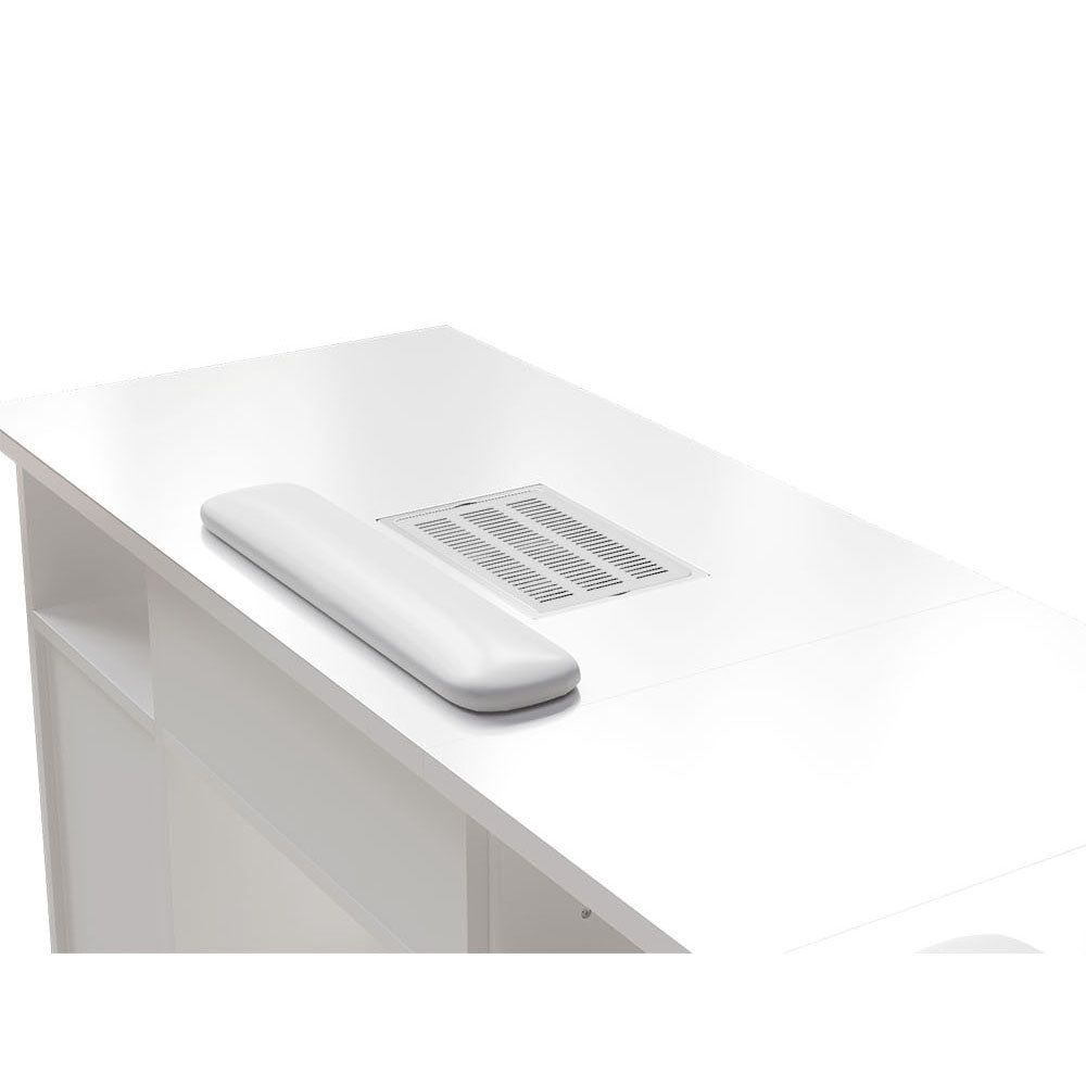 Boost the efficiency of your salon with our stylish double manicure table! Designed for two clients simultaneously, you will double your service capacity. Underneath, a wealth of storage awaits: cupboards, drawers, and open spaces for all your polishes, tools, and accessories. Keep things clean with the integrated dust extractors boasting powerful suction. We even include four extra dust bags for easy maintenance. Plus, its sleek and modern design seamlessly blends with any salon decor, creating a professional and inviting atmosphere.