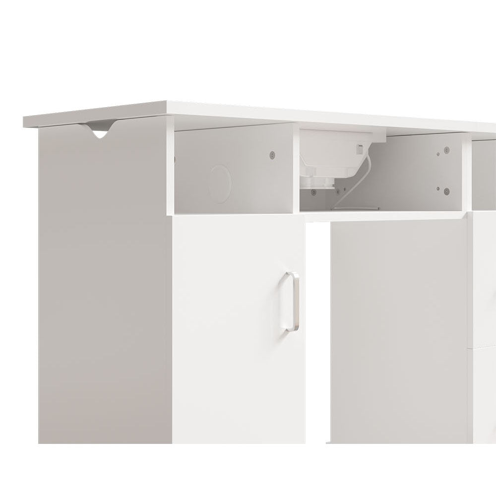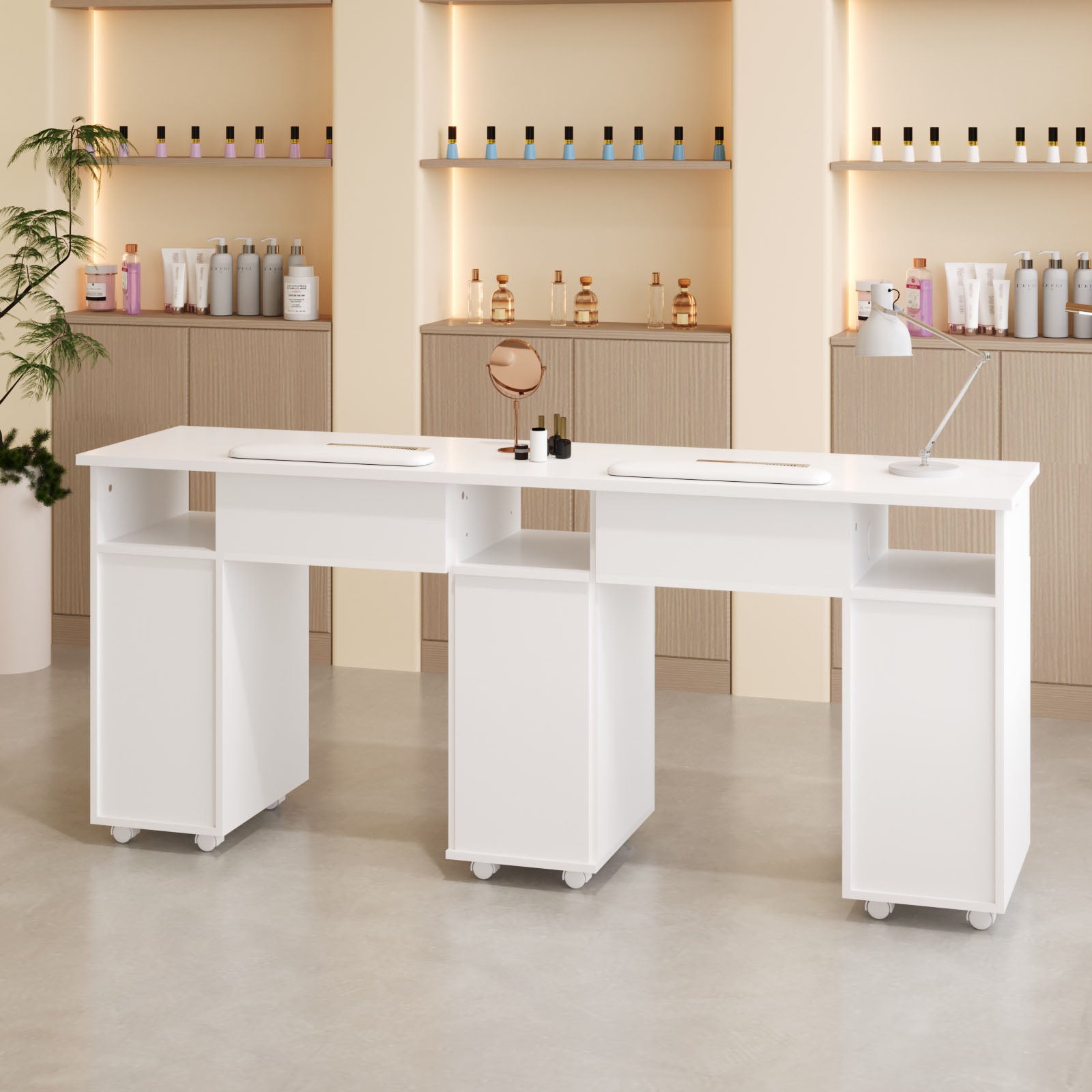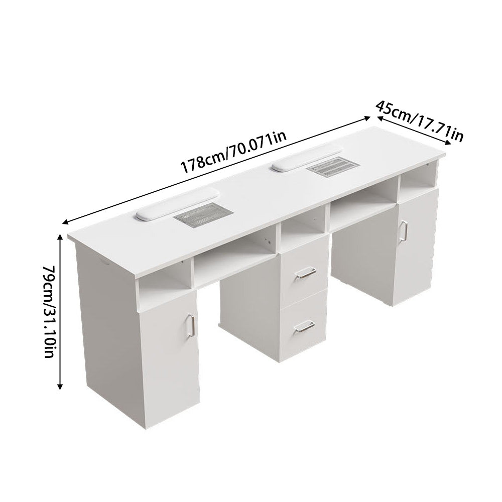 Boost the efficiency of your salon with our stylish double manicure table! Designed for two clients simultaneously, you will double your service capacity. Underneath, a wealth of storage awaits: cupboards, drawers, and open spaces for all your polishes, tools, and accessories. Keep things clean with the integrated dust extractors boasting powerful suction. We even include four extra dust bags for easy maintenance. Plus, its sleek and modern design seamlessly blends with any salon decor, creating a professional and inviting atmosphere.