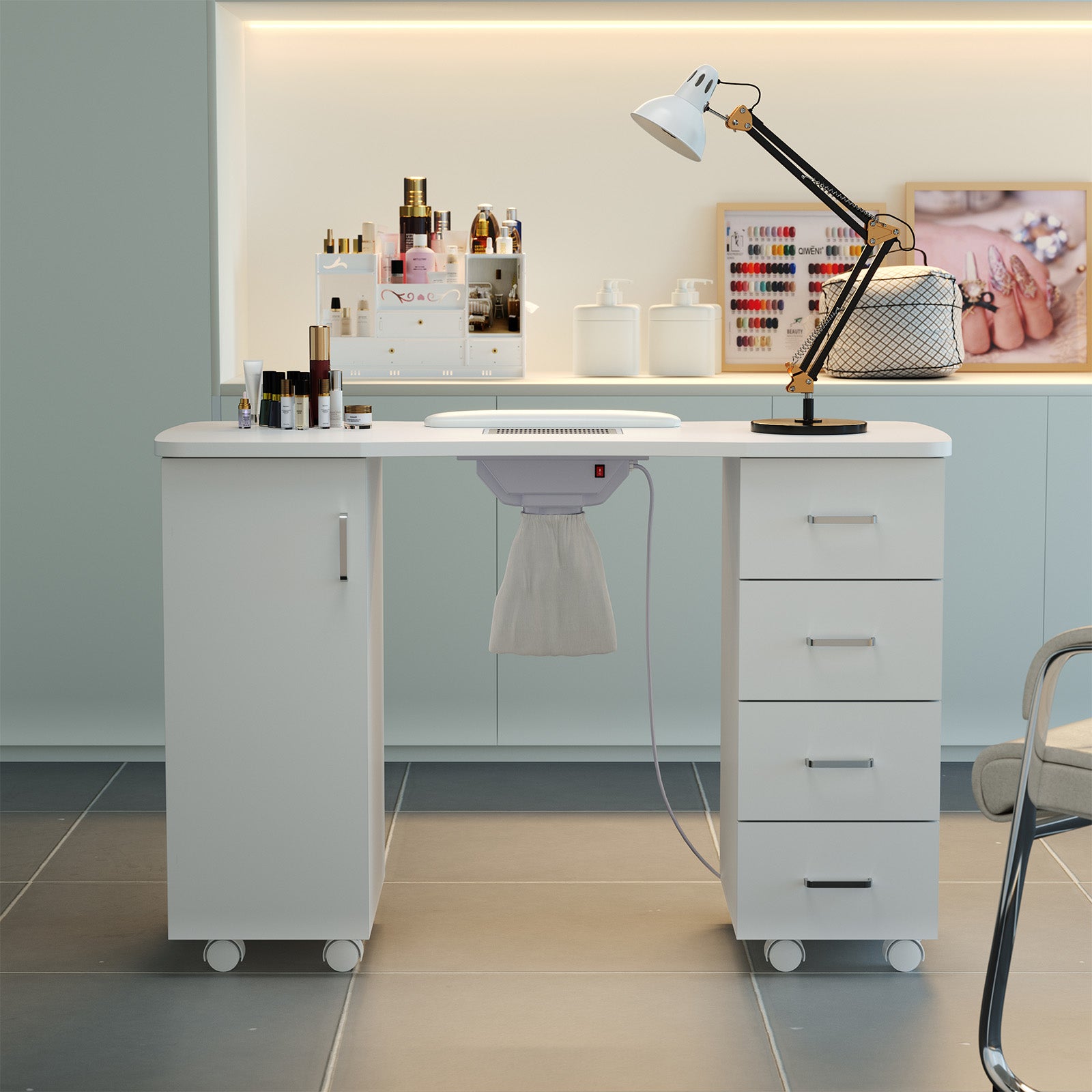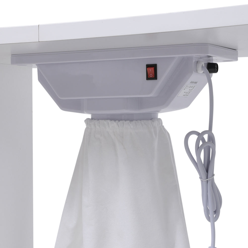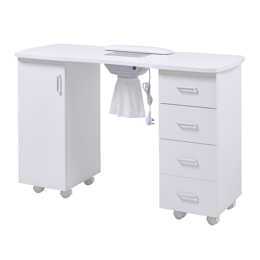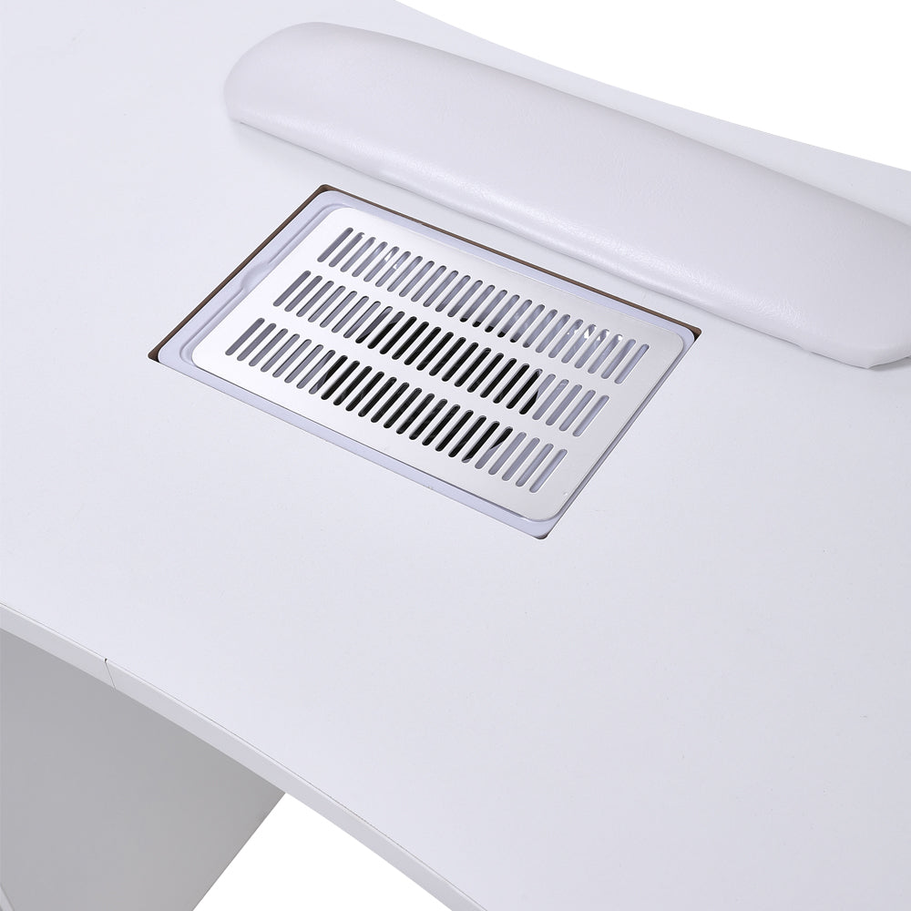 Looking for a cost-effective manicure table for both salon and home use? This one’s a winner! Built-in vent collects nail dust during manicures, keeping the salon clean and odor-free. 4 drawers + 1 cabinet provide ample storage for tools, nail polish, and disinfection supplies—easily accessible to boost work efficiency. Stain-resistant surface is easy to clean, and 8 castors ensure smooth mobility. Included wrist pillow enhances comfort, suitable for salon clients and home DIY enthusiasts. Sleek white design fits any scenario.